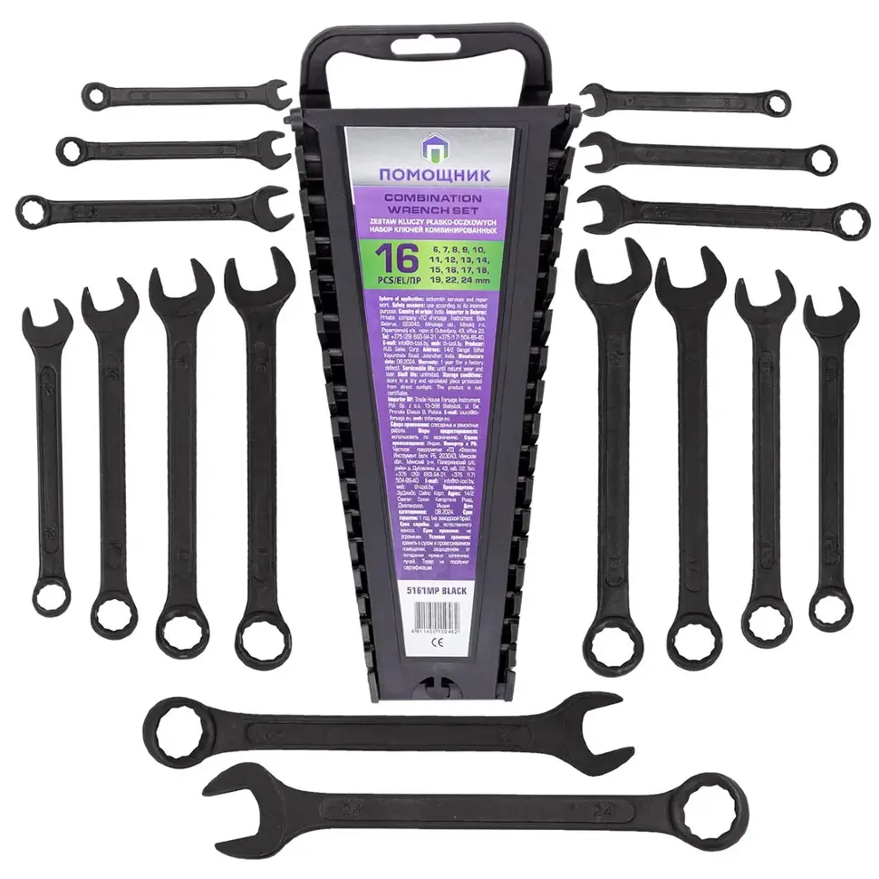 Набор комбинированных ключей Помощник 5161MP BLACK — надёжный инструмент для выполнения различных слесарных и монтажных работ. Каждый ключ имеет рожковую и накидную часть одного размера, что позволяет работать с крепежом в разных условиях, включая труднодоступные места.