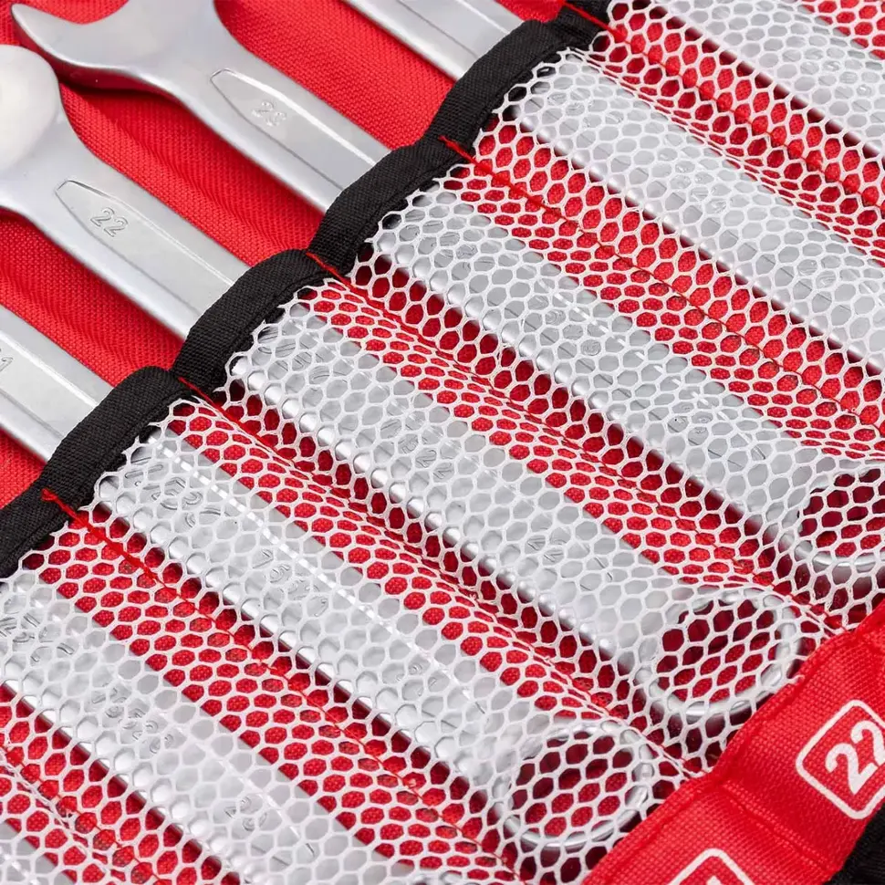 Все инструменты размещены на прочном текстильном полотне с карманами, удобном для хранения и подвешивания в мастерской или гараже.