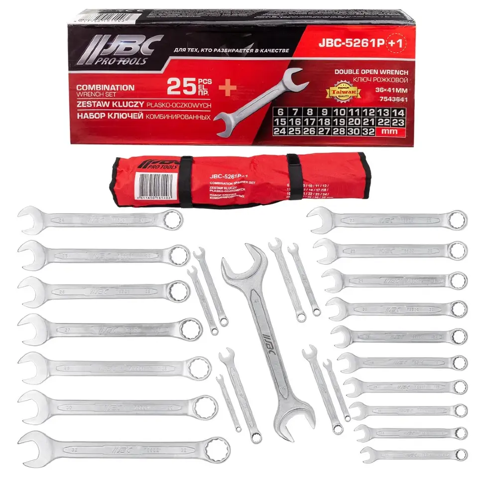 Набор ключей комбинированных JBC‑5261P+1, 25+1 пр. — универсальный комплект рожково‑накидных ключей с расширенным диапазоном размеров от 6 мм до 32 мм, дополненный крупным рожковым ключом 36×41 мм.