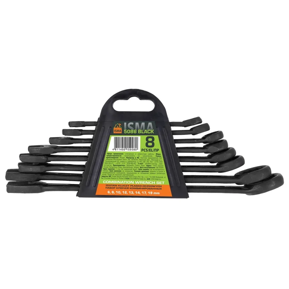 Набор ключей комбинированных 8пр.(6, 8, 10, 12-14, 17, 19мм)в пластиковом держателе ISMA ISMA-5086 BLACK