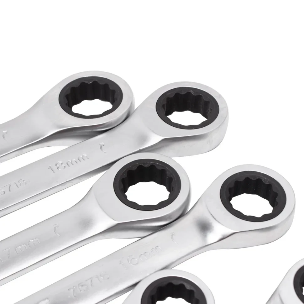 Ключи комбинированные – универсальные гаечные ключи, совмещающие в себе функционал и преимущества рожковых и накидных ключей. Зевы комбинированных ключей имеют одинаковые размеры. Ключи гаечные с открытым и кольцевым зевами предназначены для монтажа либо демонтажа резьбовых соединений. Набор изготовлен из высококачественной стали Cr-V. Трещоточный механизм в накидной части ключа позволяет комфортно работать в местах с ограниченным пространством