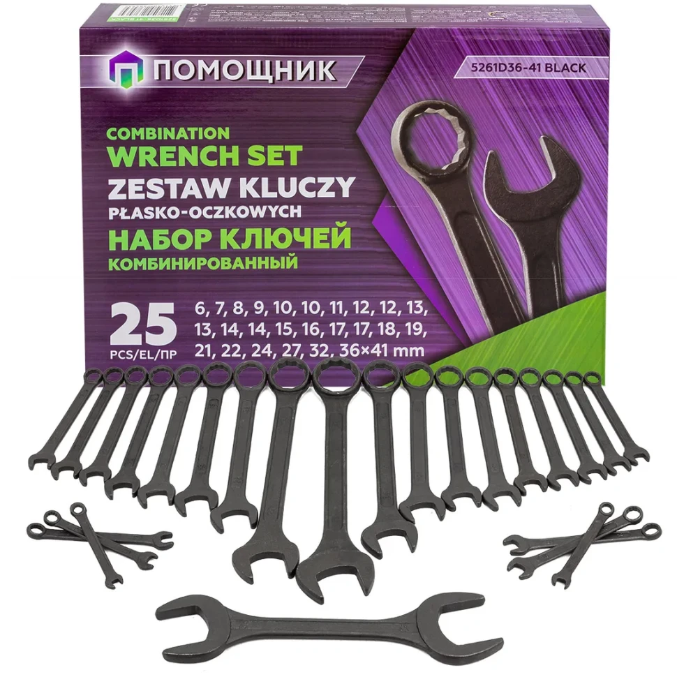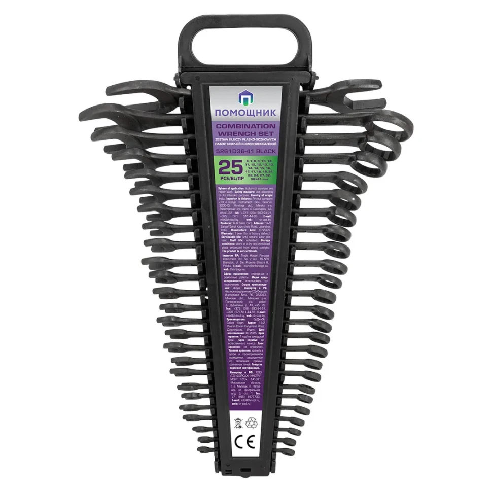 Набор комбинированных ключей Помощник 5261D36-41 BLACK из 25 предметов в пластиковом держателе включает ключи размером 6, 7, 8, 9, 10 (2 шт.), 11, 12 (2 шт.), 13 (2 шт.), 14 (2 шт.), 15, 16, 17 (2 шт.), 18, 19, 21, 22, 24, 27, 32 мм, а также ключ на 36×41 мм для работы с крупным крепежом.