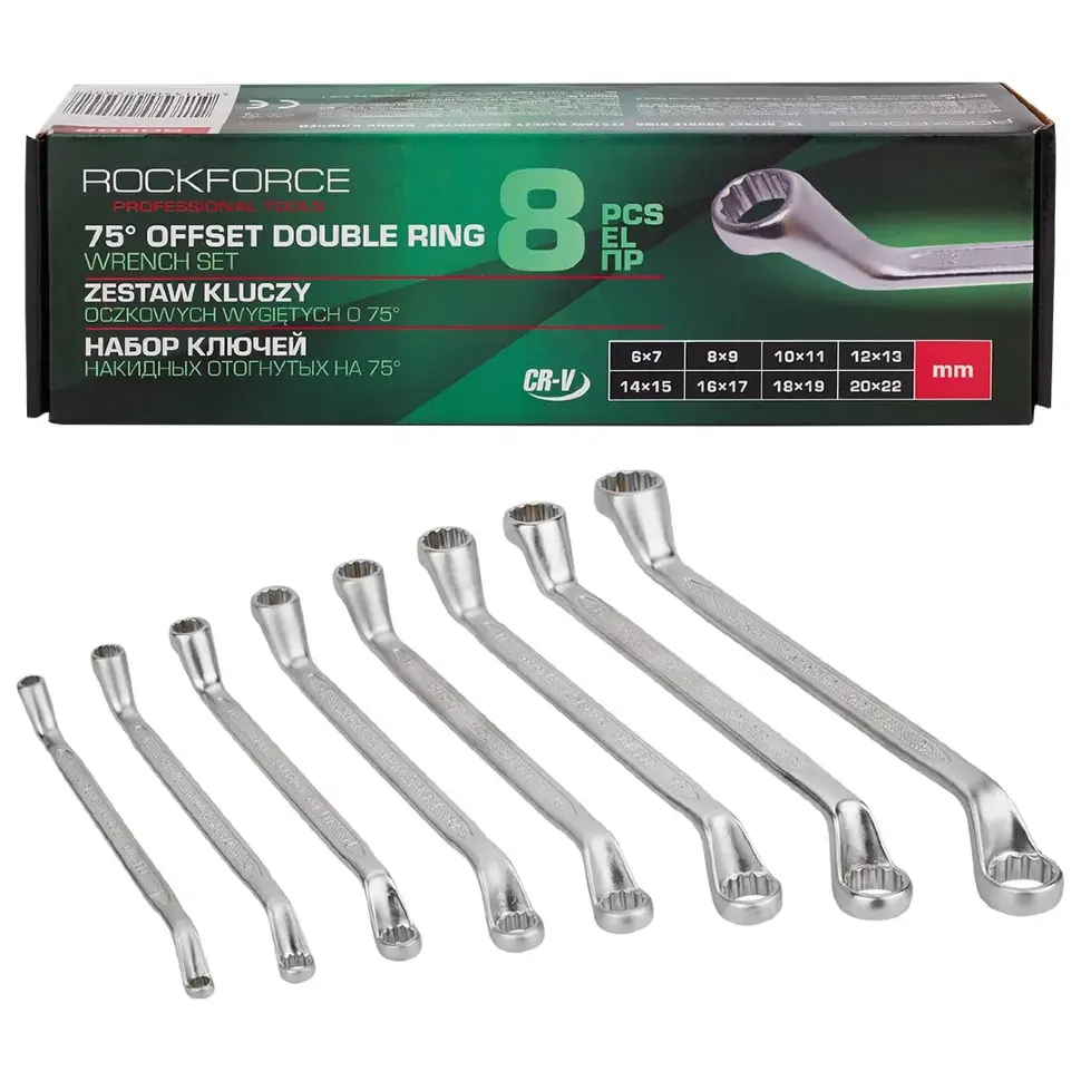 Набор ключей накидных отогнутых на 75 грд. 8 пр. (6х7, 8х9, 10х11, 12х13, 14х15, 16х17, 18х19, 20х22мм.) Rock FORCE RF-5088P