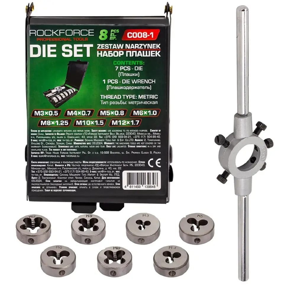 Набор плашек, 8 пр. RockFORCE RF‑C008‑1 — практичный комплект для нарезания и восстановления наружной метрической резьбы. Подходит для использования в автосервисах, мастерских и при бытовом ремонте.