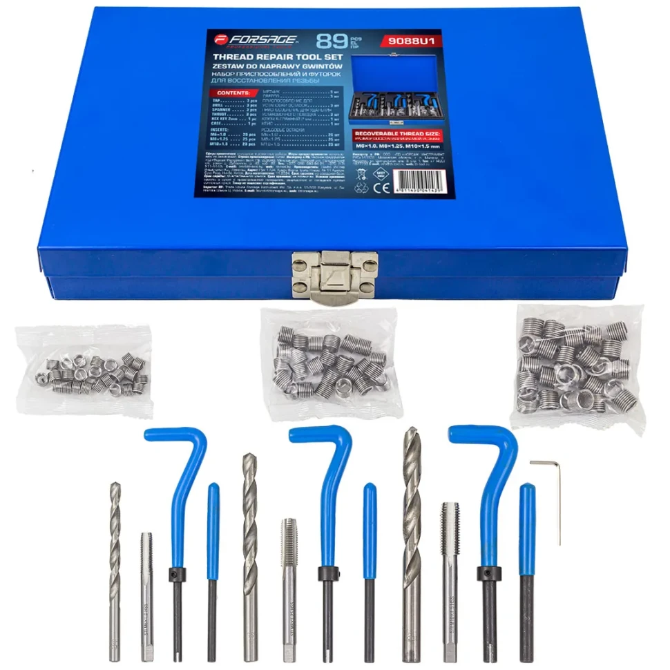 Набор приспособлений и футорок для восстановления резьбы 131 предмета от бренда FORSTIME предназначен для восстановления внутренней резьбы, которое осуществляется путём вкручивания пружинной резьбовой вставки.