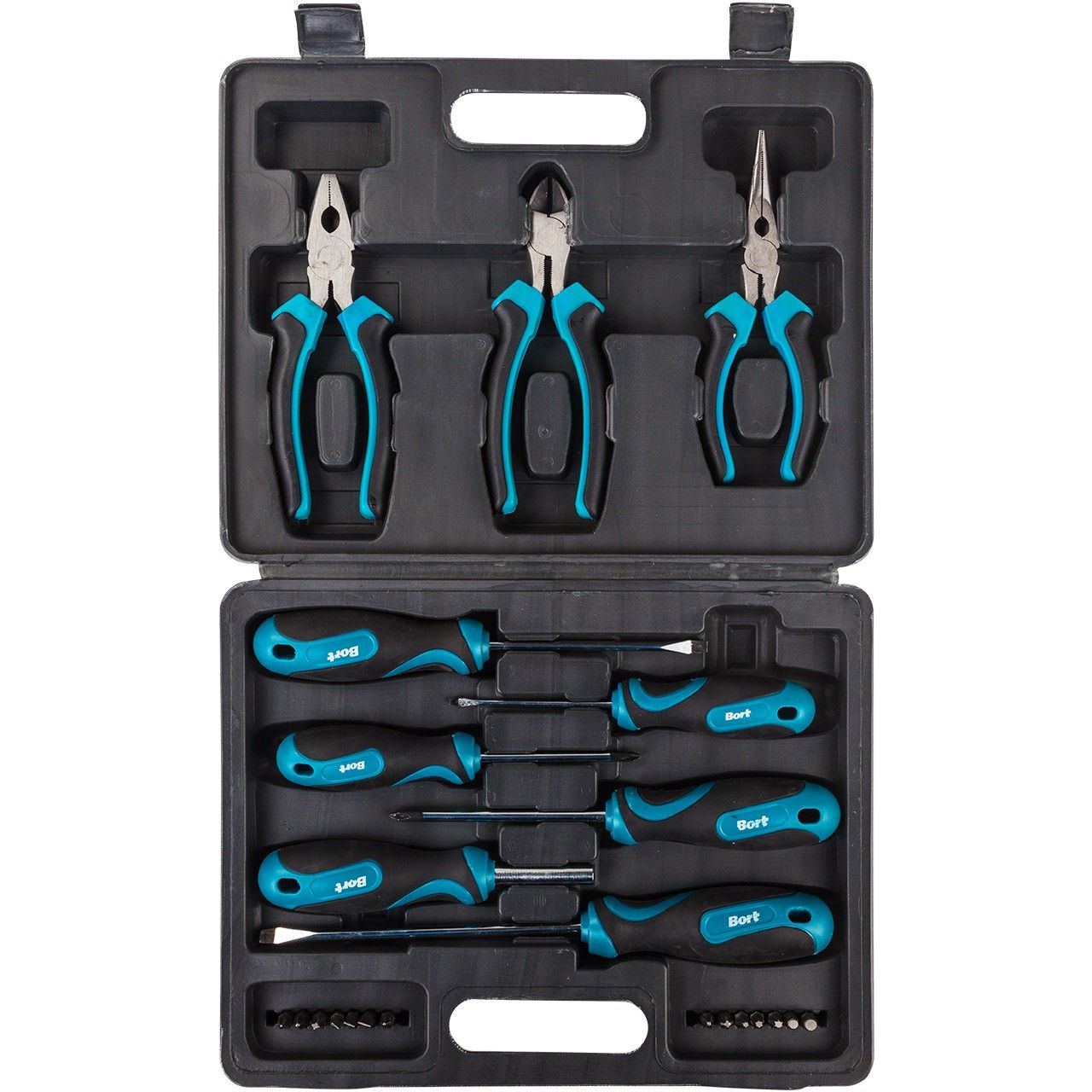 - В набор входят биты 25мм в количестве 14 шт. для разных типов саморезов и отвертка-держатель для них, плоскогубцы, бокорезы, тонкогубцы для работ с небольшими деталями, 5 типов отверток на любой случай.