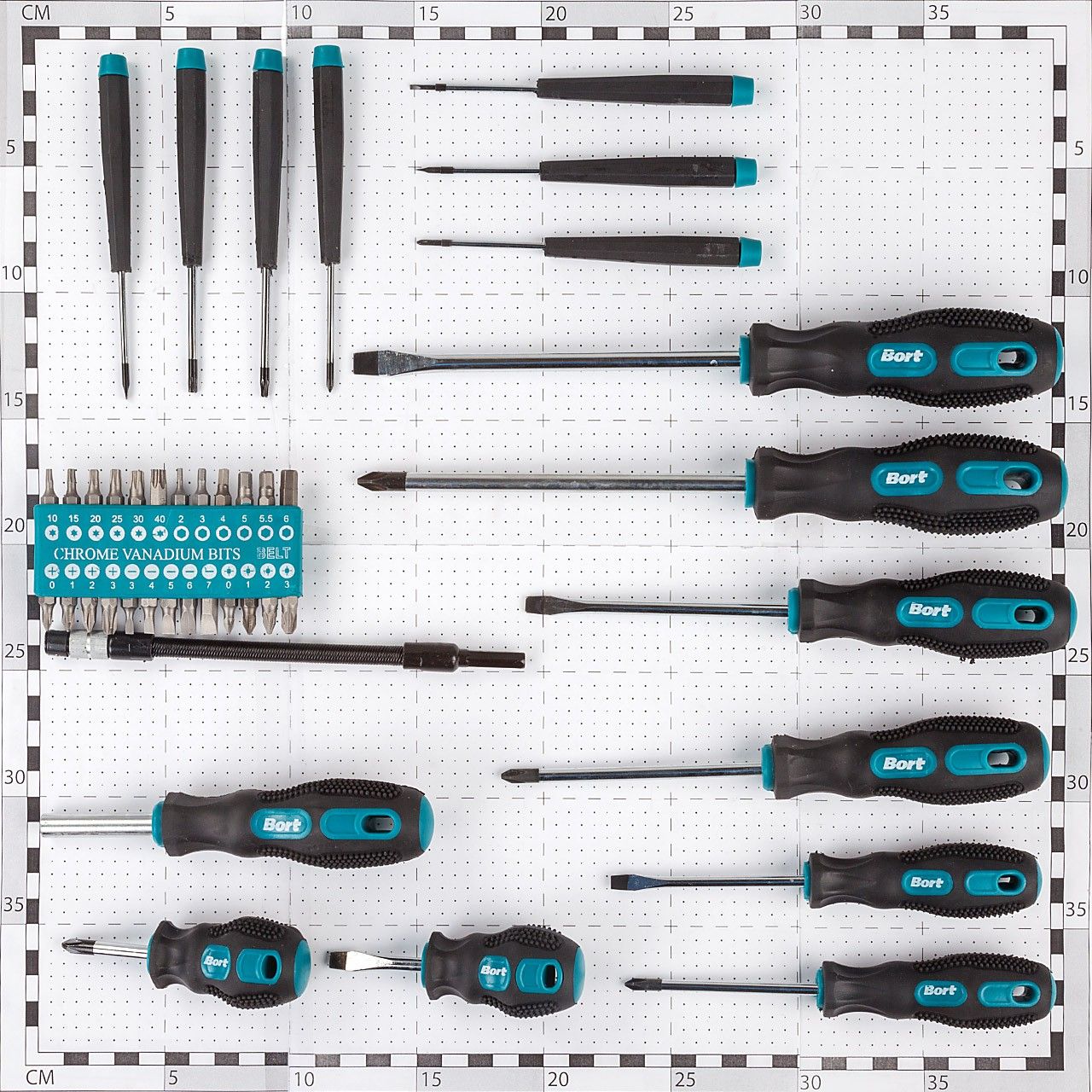 - В состав набора входят 25 всевозможных видов бит размером 25мм для разных типов саморезов, отвертка-держатель для бит, гибкий удлинитель для уверенной работы в труднодоступных местах, 8 отверток с различной длиной ручки, 7 часовых отверток 50мм для работы с техникой, например, компьютером или телефоном.