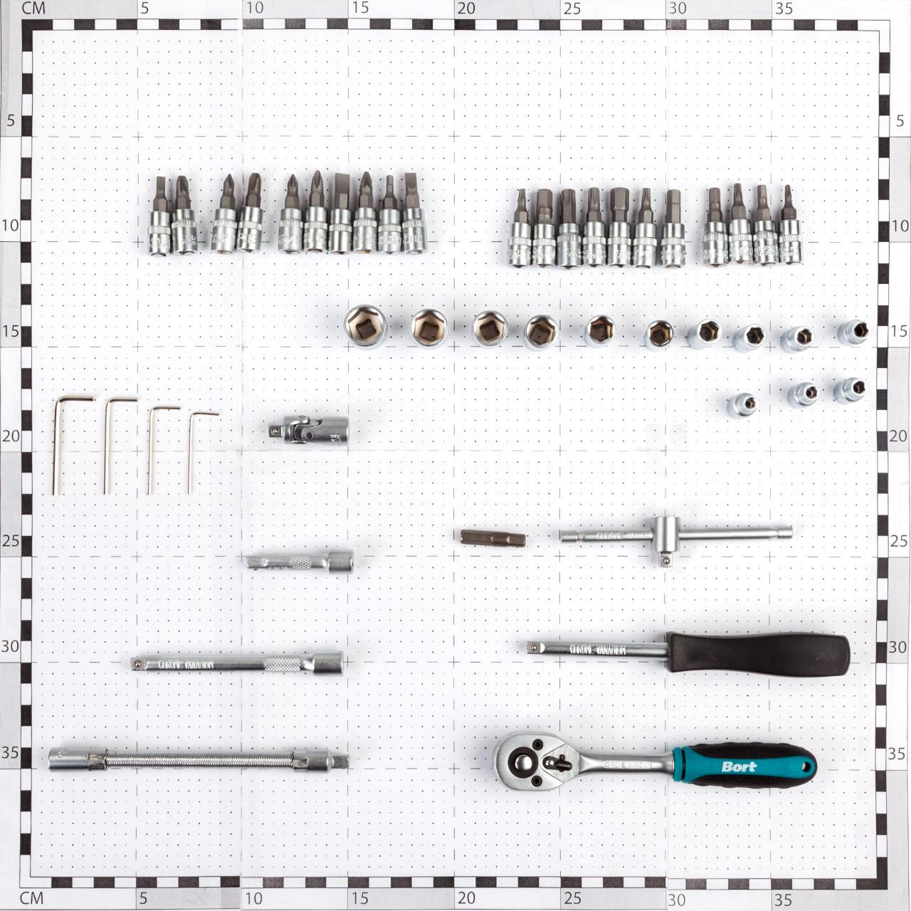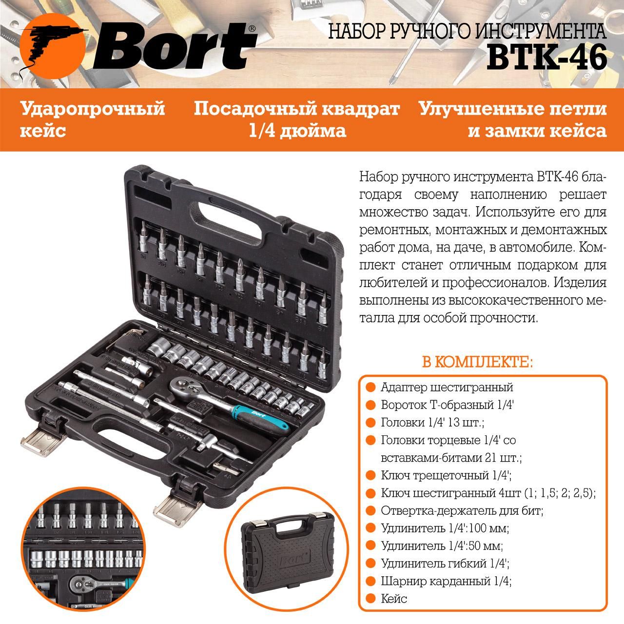 Набор ручного инструмента BTK-46 благодаря своему наполнению решает множество задач. Используйте его для ремонтных, монтажных и демонтажных работ дома, на даче, в автомобиле. Комплект станет отличным подарком для любителей и профессионалов. Инструменты помещены в стильный легкий кейс для удобного хранения и транспортировки. Улучшенные петли и замки обеспечивают удобное применение в течение всего срока службы. Изделия выполнены из высококачественного металла для особой прочности. В комплект входят: головки 13 размеров, торцевые головки с аналогичным посадочным квадратом и со вставками-битами для различных видов крепежных материалов, отвертка для бит, трещоточный ключ на 72 зуба с возможностью быстрого сброса, шестигранный адаптер, удлинители в двух размерах, гибкий удлинитель для работы в труднодоступных местах, Т-образный вороток, шестигранный ключ в 4-х размерах и карданный шарнир. Посадочный размер инструментов из набора — ¼ дюйма, самый распространенный формат.