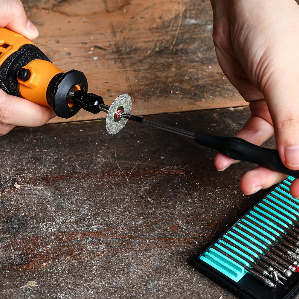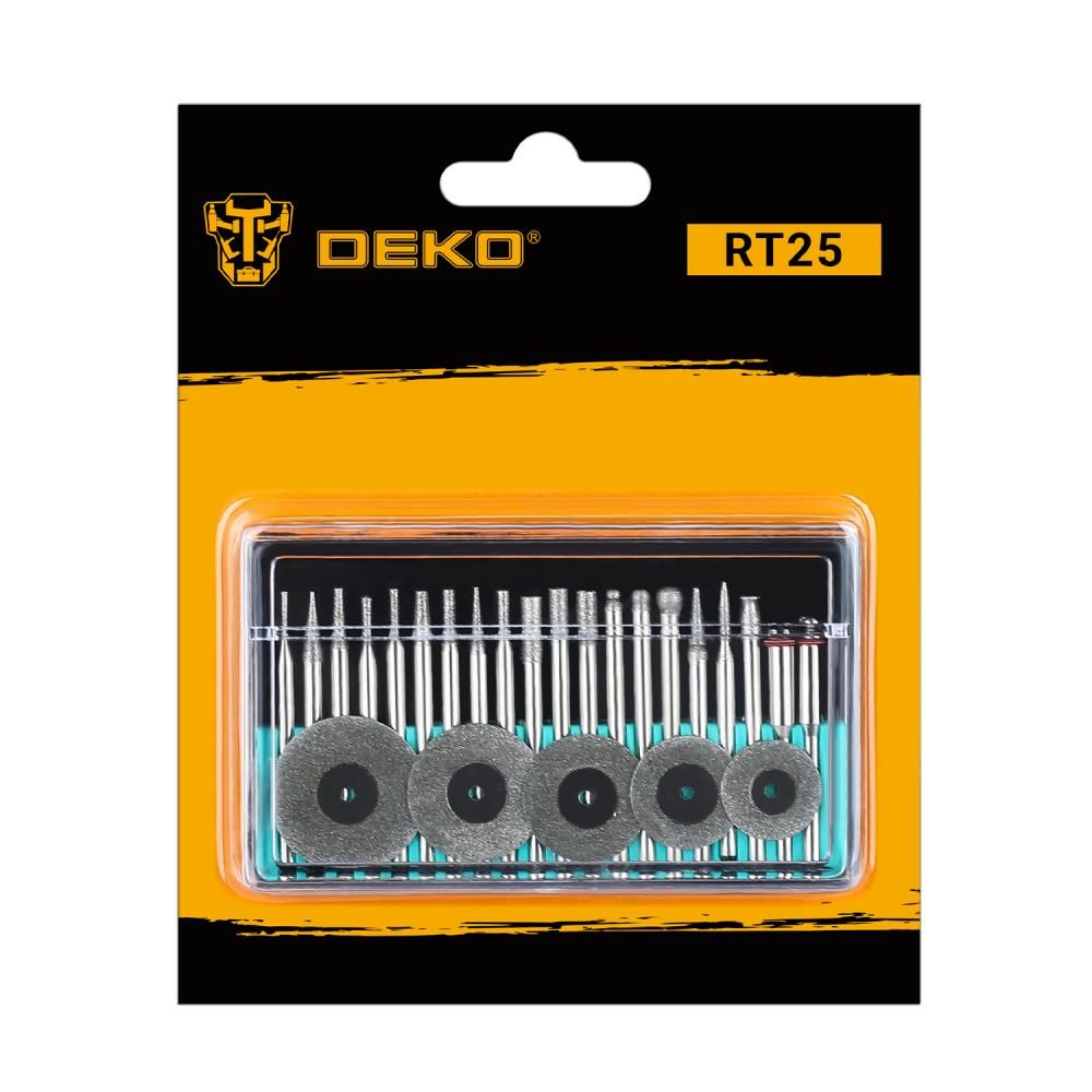 - Набор алмазных шарошек и отрезных дисков DEKO RT25 предназначен для обработки и резки изделий из металла, бетона, древесины, керамики, мрамора с помощью гравировальной машинки.