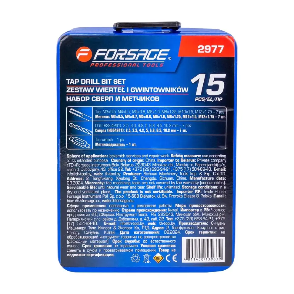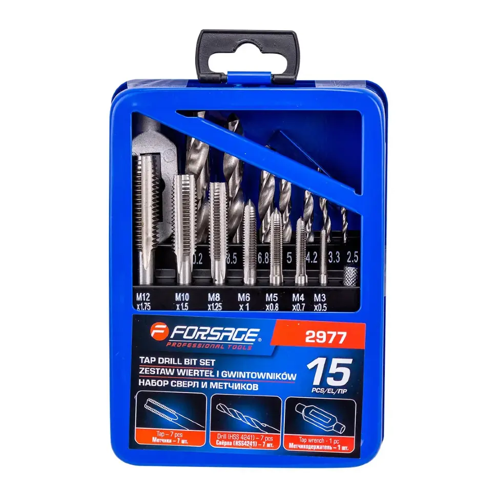 Набор сверл и метчиков, 15 пр. Forsage F‑2977 — универсальный комплект для сверления и нарезания метрической резьбы. Подходит для автосервиса, мастерских и бытового применения, обеспечивая полный цикл работ: от подготовки отверстия до формирования резьбы.