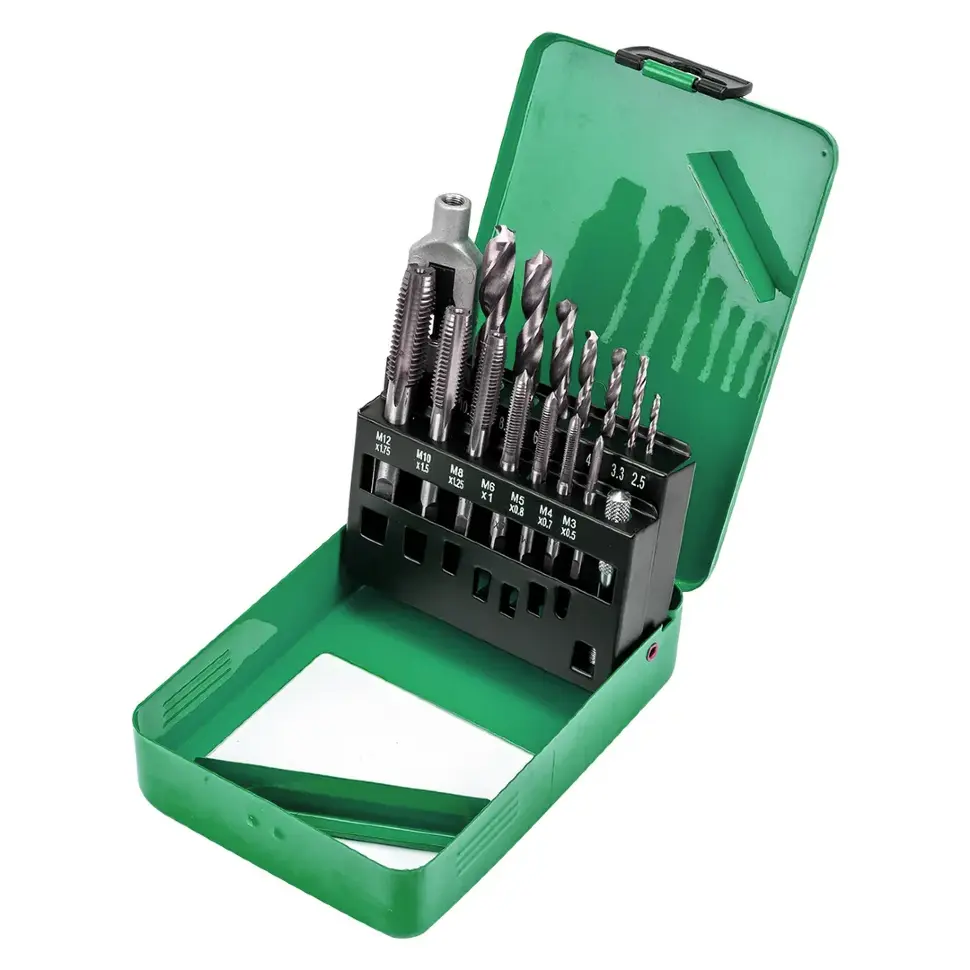 Набор сверл и метчиков, 15 пр. RockFORCE RF‑2977 — универсальный комплект для сверления и нарезания метрической резьбы. Подходит для автосервиса, мастерских и бытового применения, обеспечивая полный цикл работ: от подготовки отверстия до формирования резьбы.