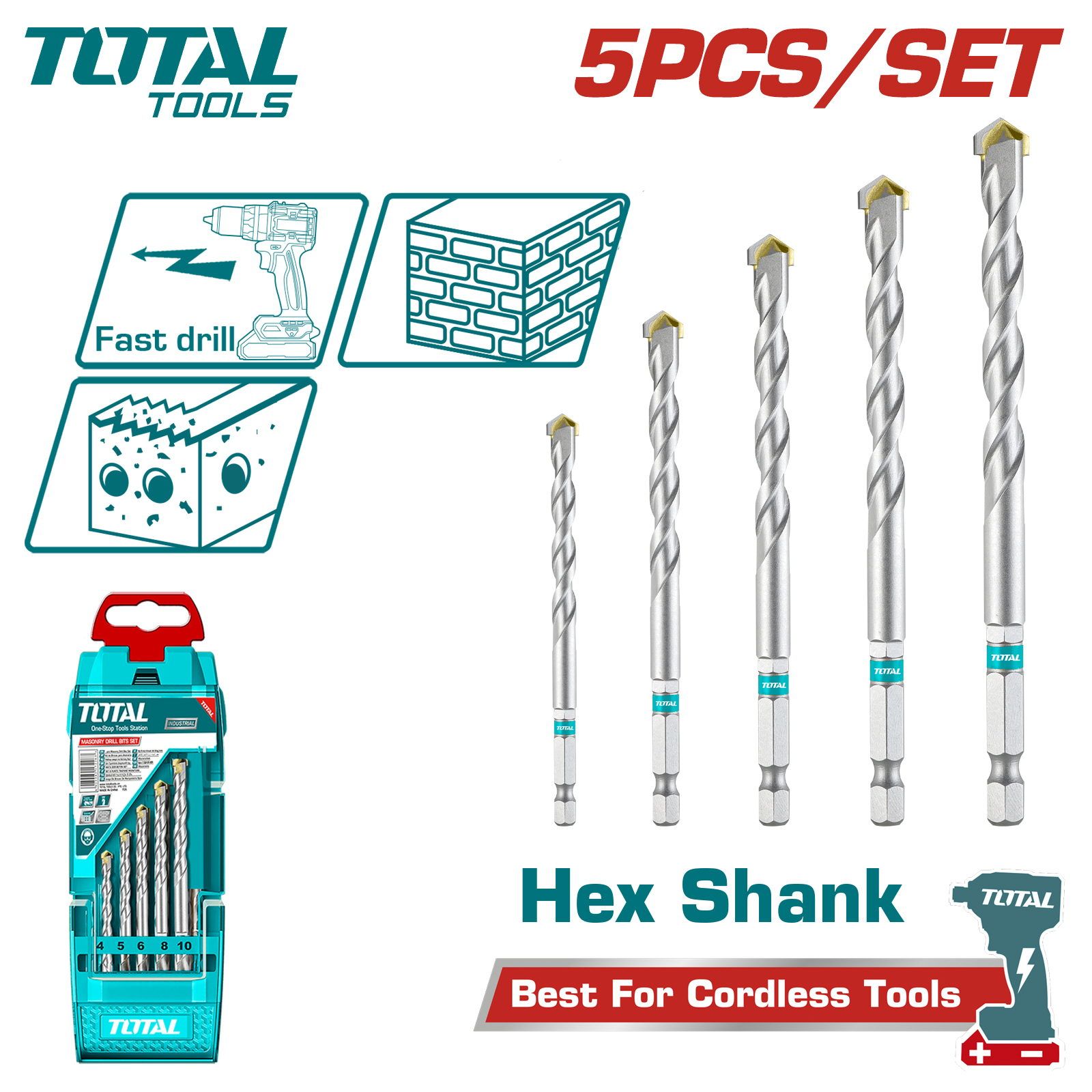 - В наборе 5 сверл диаметром 4, 5, 6, 8, 10мм.