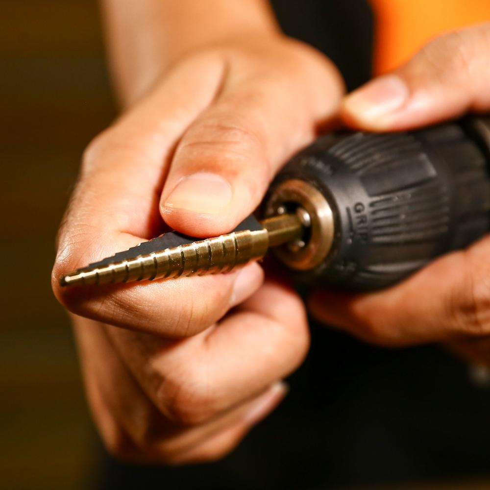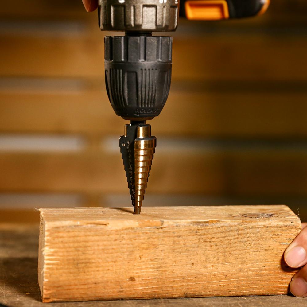 - Набор сверл ступенчатых в металлическом кейсе DEKO DH22 изготовлен из быстрорежущей стали (HSS) с покрытием из нитрида титана для увеличения срока службы.