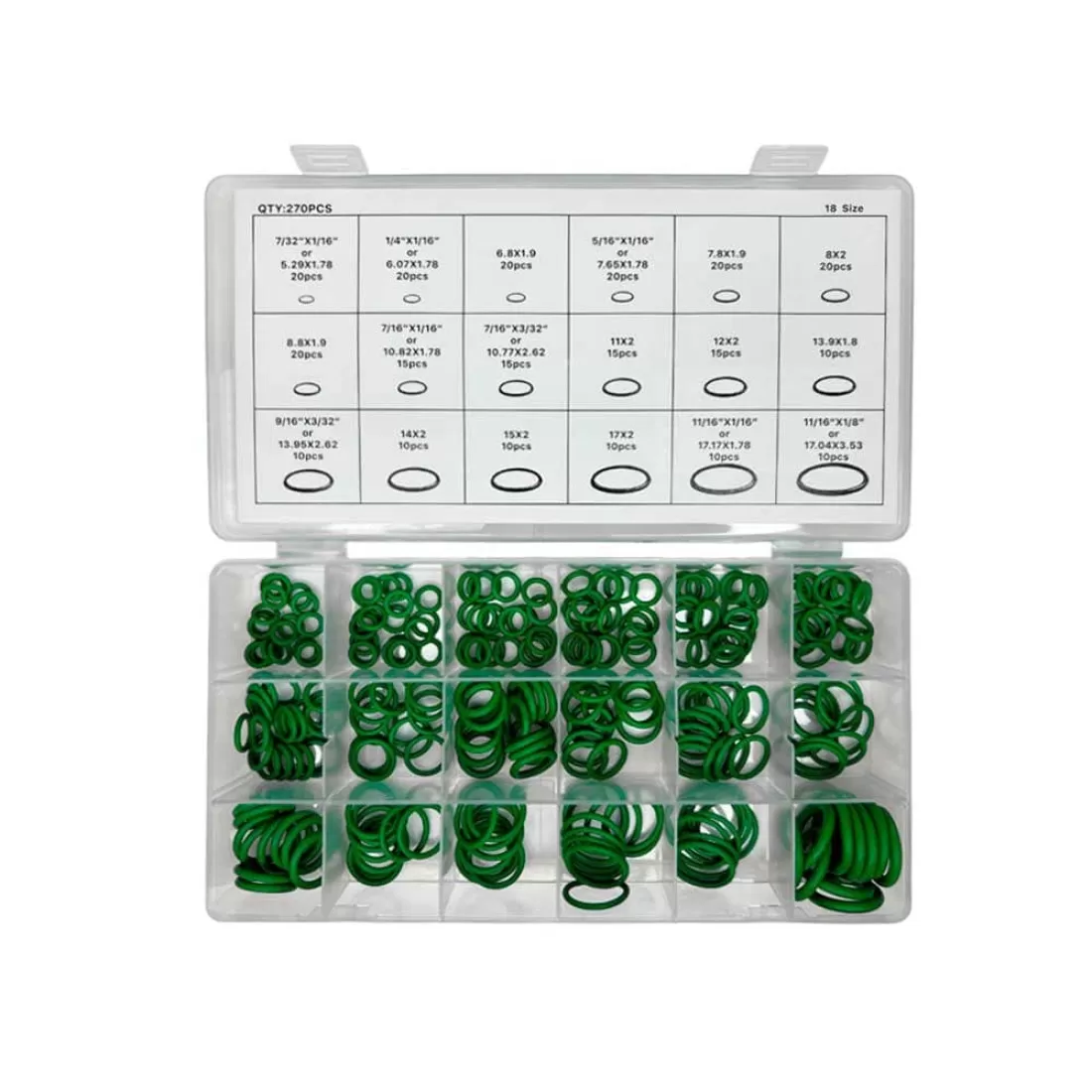 Универсальный комплект уплотнительных колец для обслуживания и ремонта автомобильных систем кондиционирования. Подходит для всех типов резьбовых и быстросъёмных соединений фреоновых магистралей.