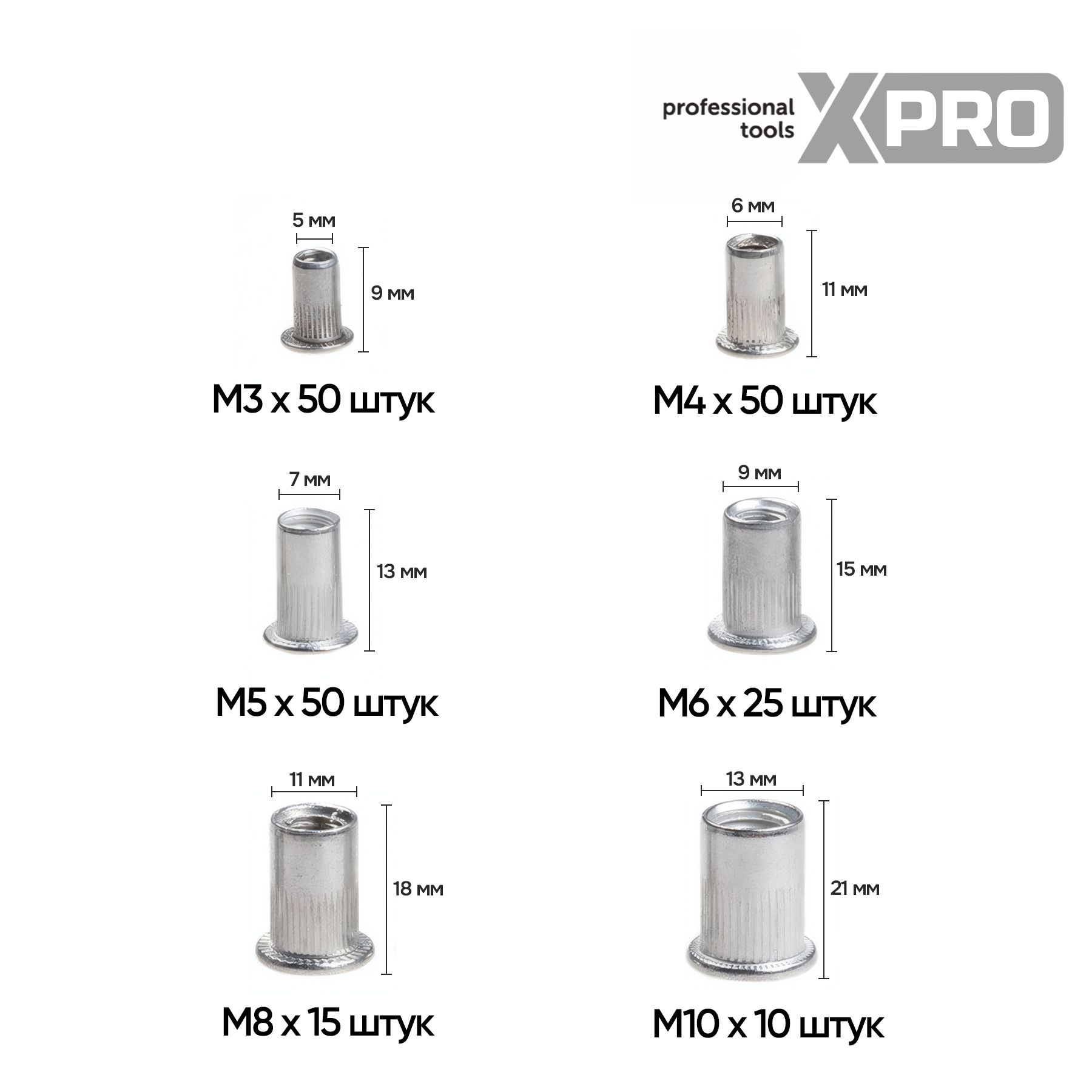 Набор заклепок резьбовых, М3-М10, 200 шт, белый цинк, в пласт. кейсе XPRO XR-135200K