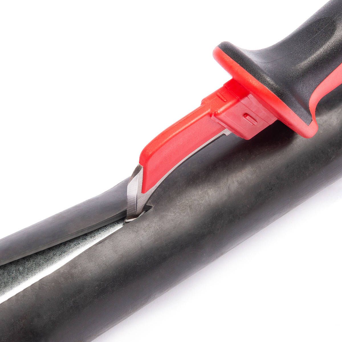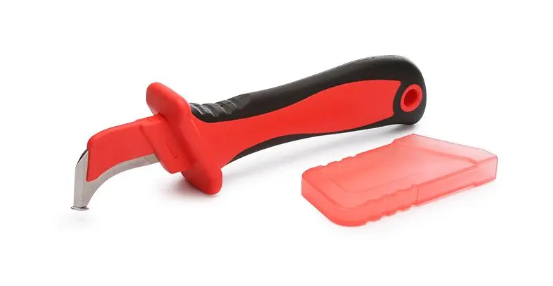 - Частично изолированное изогнутое лезвие с «пяткой» для легкого вскрытия оболочки кабеля без риска повреждения жилы