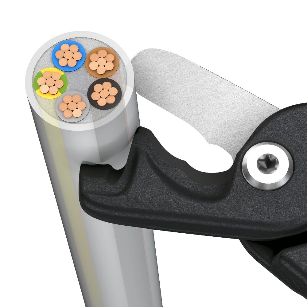 - Отличная режущая способность: разрезает одножильные медные или алюминиевые кабели сечением до 35 мм², многожильные кабели сечением до 70 мм² и тонкие многожильные кабели сечением до 120 мм²