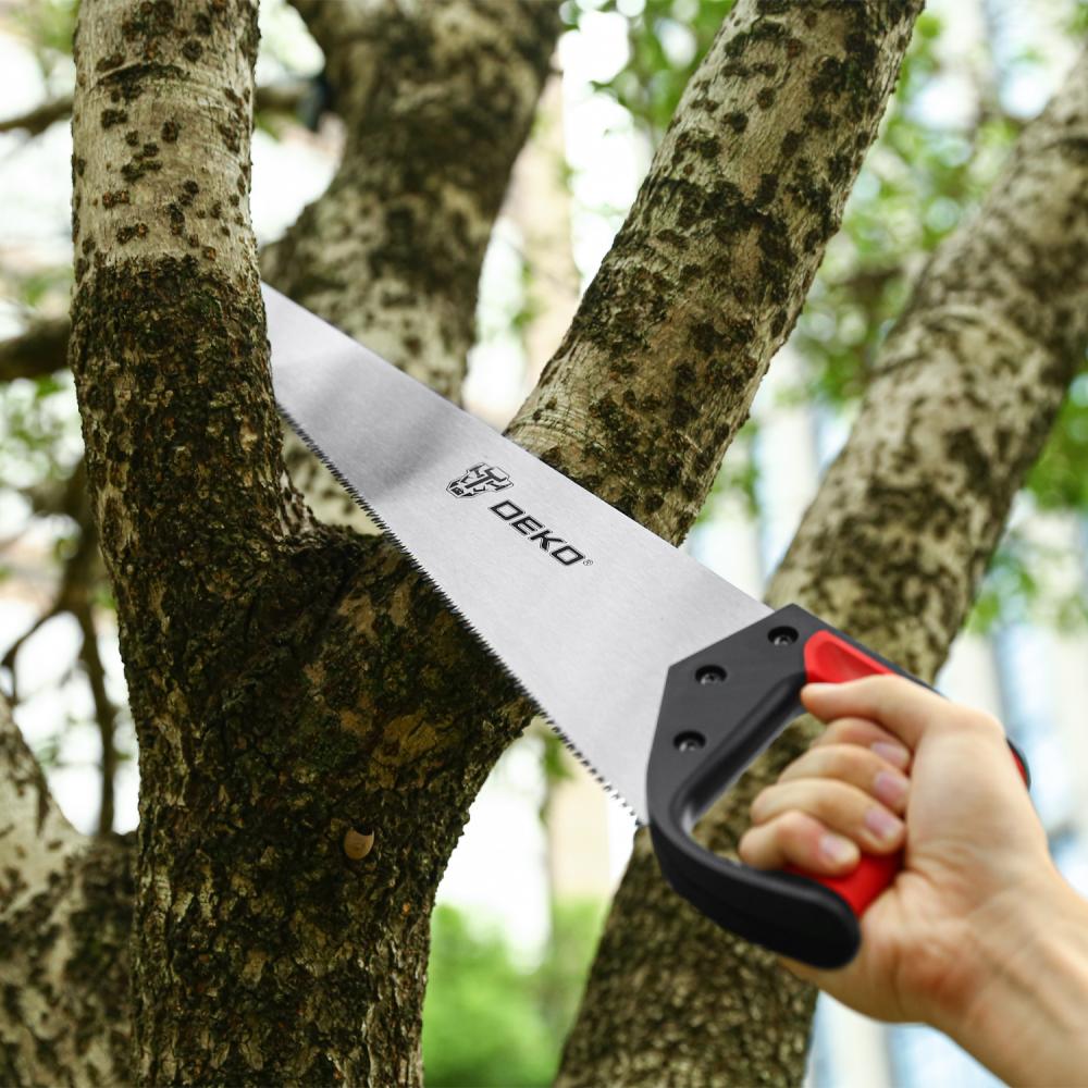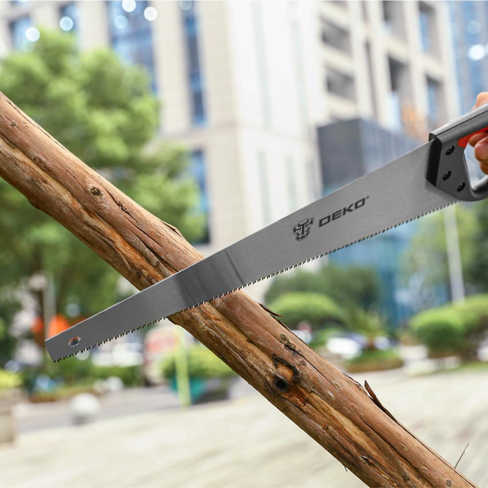 - Ножовка (пила) по дереву DEKO DKHS02 подходит для распила как сухой, так и сырой древесины, обеспечивая чистый срез высокой точности и скорости.