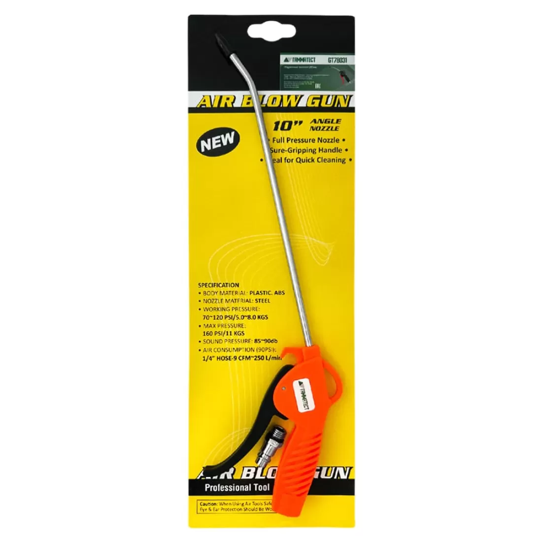Обдувочный пистолет ГАММАТЕСТ GT7B031 — пневматический обдувочный пистолет с удлинённым соплом длиной 200 мм, предназначенный для быстрой и эффективной очистки рабочих поверхностей, деталей и узлов от пыли, стружки и мелкого мусора в мастерских, на производстве и в автосервисах.