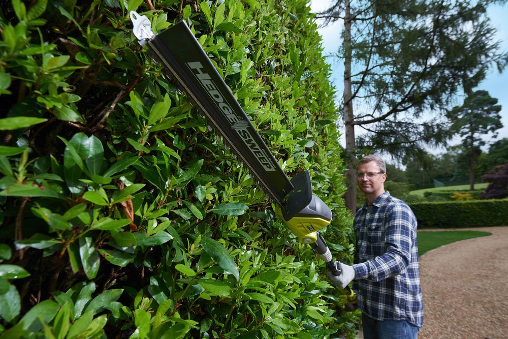 - Мощный 18В двигатель позволяет стричь живые изгороди и кусты.