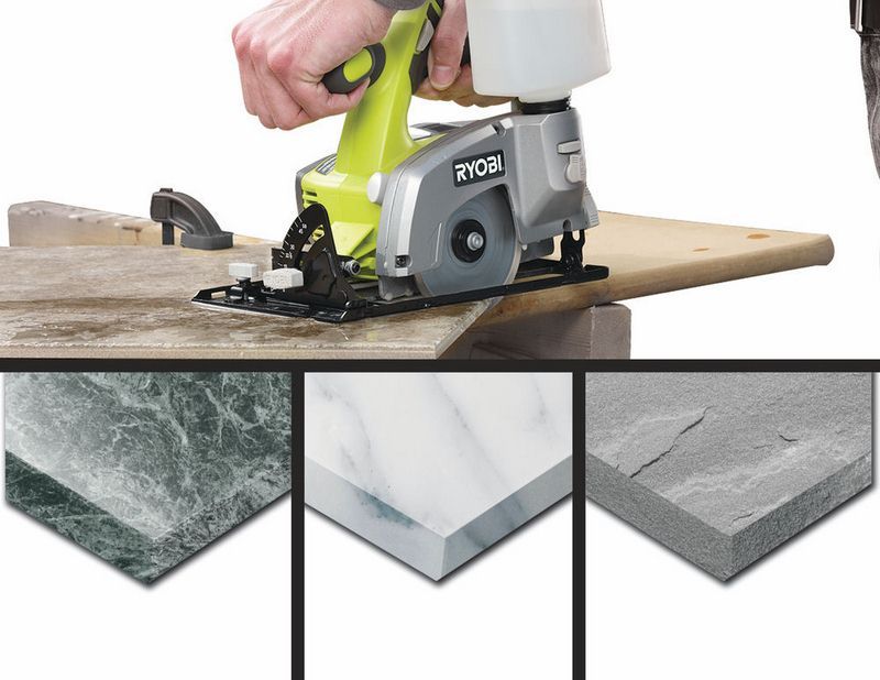 - Мощный 18В двигатель позволяет резать керамику, гранит, мрамор и камень.