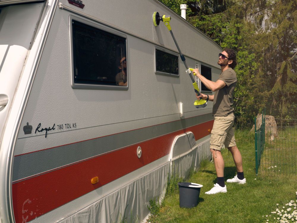 - Аккумуляторная телескопическая щетка идеальна для чистки гaражных ворот, наружных стен или автомобилей