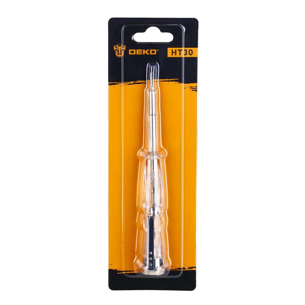 - Индикаторная отвертка DEKO HT30 оснащена световой индикацией, позволяет определить наличие напряжения в проводнике.