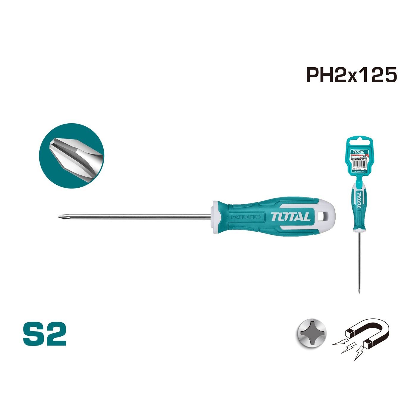 - Крестовая отвертка Phillips PH2x125 мм TOTAL THT26PH2125 ручной инструмент, используемый для широкого спектра работ с крепежом.