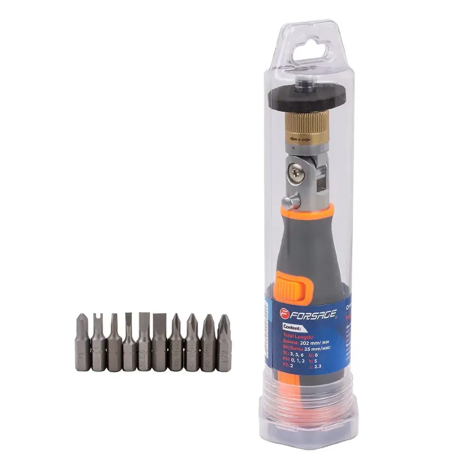 Отвёртка реверсивная Forsage F‑32810 — это универсальный инструмент с трещоточным механизмом и набором сменных бит, предназначенный для широкого спектра монтажных и ремонтных работ.