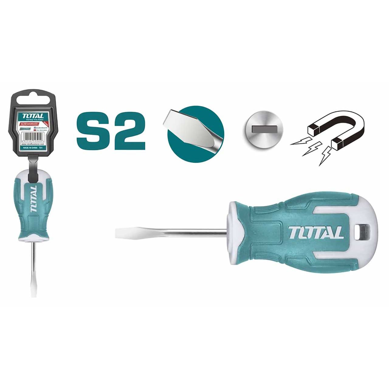 - Профессиональная компактная отвертка шлицевая SL6.5x38mm TOTAL THT266038 ручной инструмент, используемый для широкого спектра работ с крепежом.