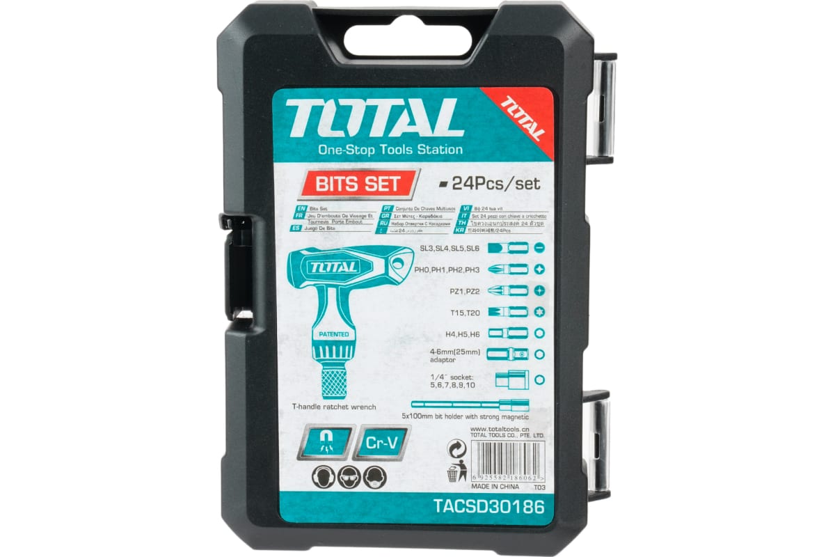 - Профессиональная Т-образная отвертка TOTAL TACSD30186 с набором бит и головок предназначена для монтажно-демонтажных работ с резьбовыми соединениями следующих типов шлицев: SL, PZ и PH.