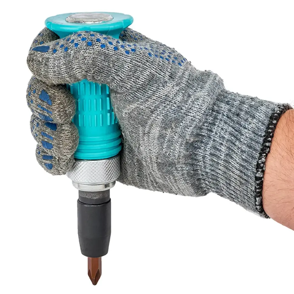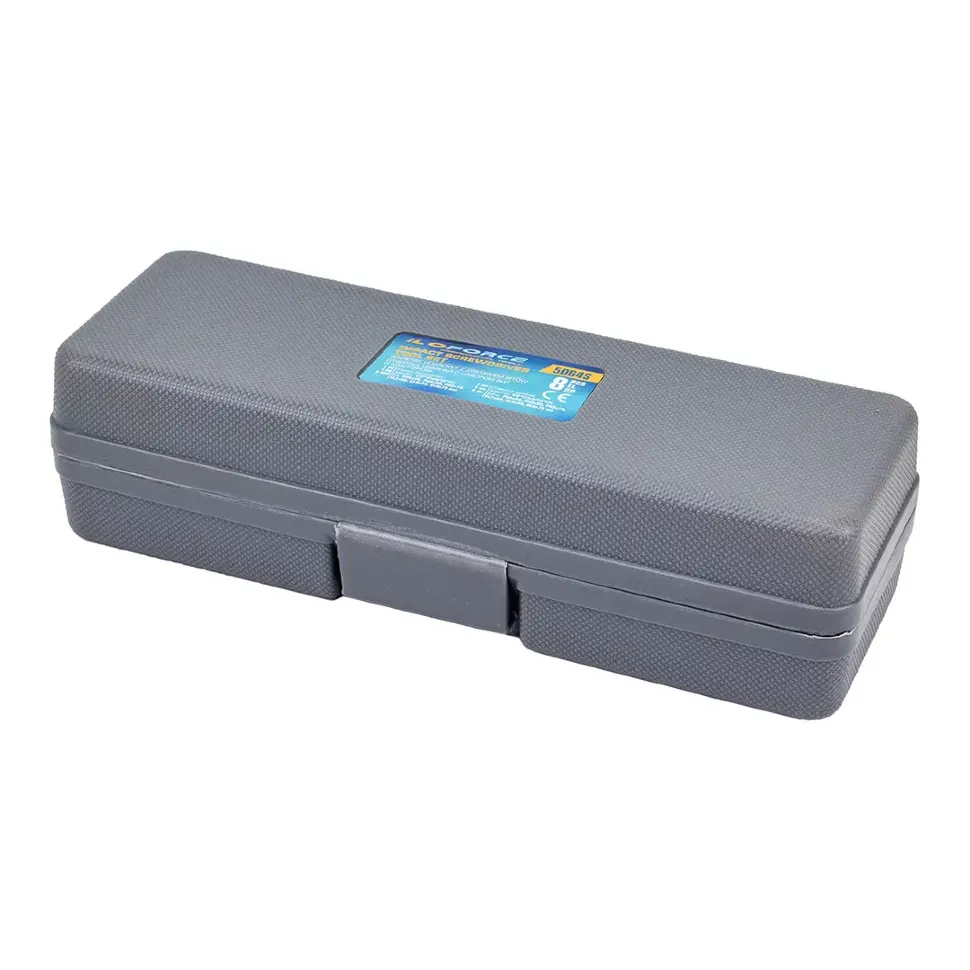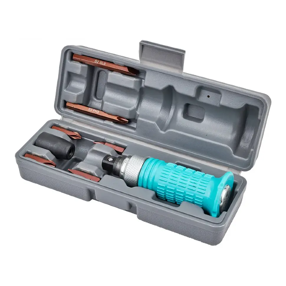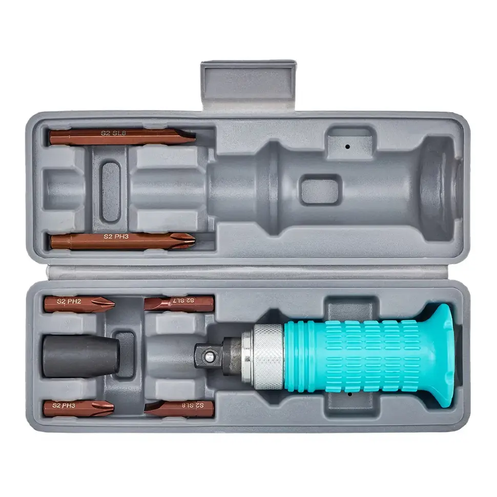 В набор входят ударная отвёртка с реверсивным механизмом, адаптер 1/2" × 5/16", а также 6 бит: крестовые PH2, PH3 и шлицевые SL7, SL8 (короткие 36 мм и длинные 70 мм). Биты изготовлены из прочной стали S2, устойчивой к высоким нагрузкам и износу. Рукоять обрезинена для надёжного хвата и предотвращения скольжения. Комплект упакован в прочный пластиковый кейс с секциями, что обеспечивает удобство хранения и быстрый доступ к инструменту.