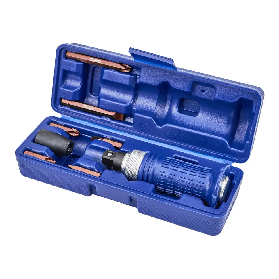 В набор входят ударная отвёртка с реверсивным механизмом, адаптер 1/2" × 5/16", а также 6 бит различной длины и профиля: крестовые PH2, PH3 и шлицевые SL7, SL8 (длиной 36 мм и 70 мм). Все элементы изготовлены из прочной стали S2, устойчивой к высоким нагрузкам. Рукоять обрезинена для комфортного хвата и защиты от скольжения. Комплект упакован в прочный пластиковый кейс с секциями, обеспечивающим удобство хранения и быстрый доступ.