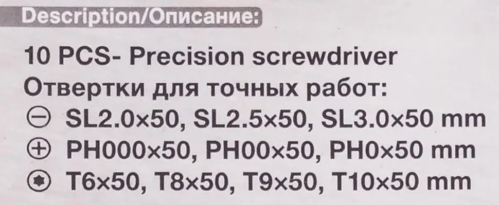 Torx (T): T6×50 мм, T8×50 мм, T9×50 мм, T10×50 мм