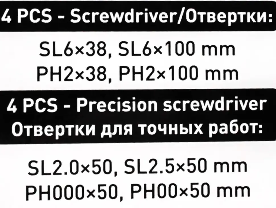 Набор включает 4 стандартные и 4 прецизионные ручные отвёртки, предназначенные для выполнения как базовых слесарных, так и точных монтажных задач.