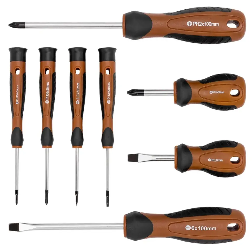 Тип инструмента: Ручной инструмент из категории универсальных и прецизионных наборов. Стандартные отвёртки подходят для надёжного закручивания/откручивания винтов и шурупов в бытовых и слесарных работах. Прецизионные — для аккуратной работы с мелкими крепежами в электронике, часовых механизмах и цифровых устройствах.