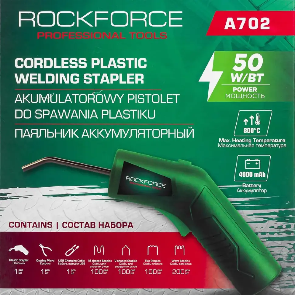 Паяльник аккумуляторный беспроводной RockFORCE (50 Вт, 3.7 В, макс. температура 800 °C) — это удобный инструмент, предназначенный для ремонта пластиковых деталей и изделий путём их армирования металлическими скобами. С его помощью можно эффективно устранять трещины, разрывы и разломы различной конфигурации.