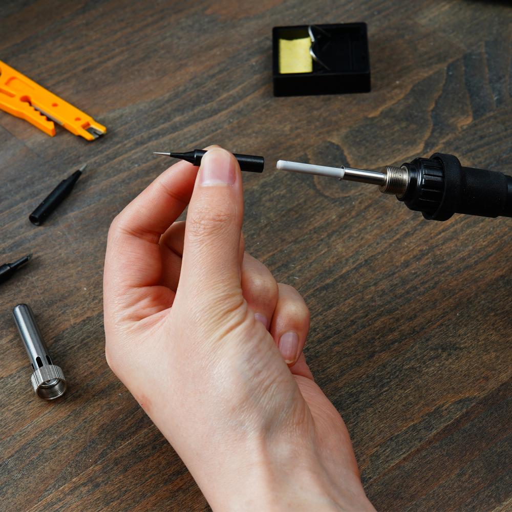 - Благодаря наличию самых популярных типов наконечников и и регулятора температуры на рукояти паяльник цифровой DEKO SI11 80Вт/220В в кейсе с набором аксессуаров отлично подойдет для выполнения различных паяльных работ.