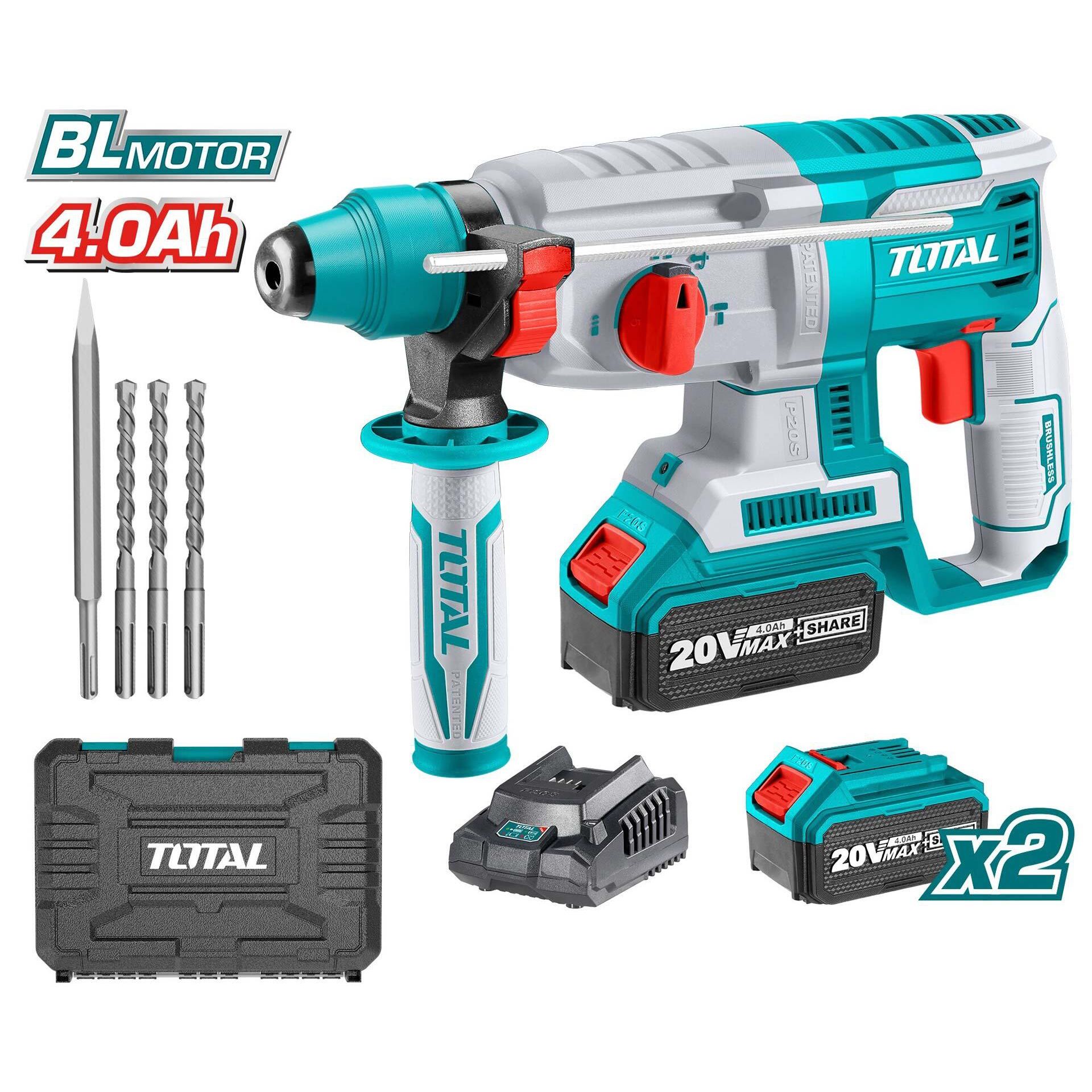 - Перфоратор входит в линейку инструментов TOTAL P20S и совместим со всеми аккумуляторами TOTAL 20В - TFBLI20011, TFBLI2002, TFBLI2053.