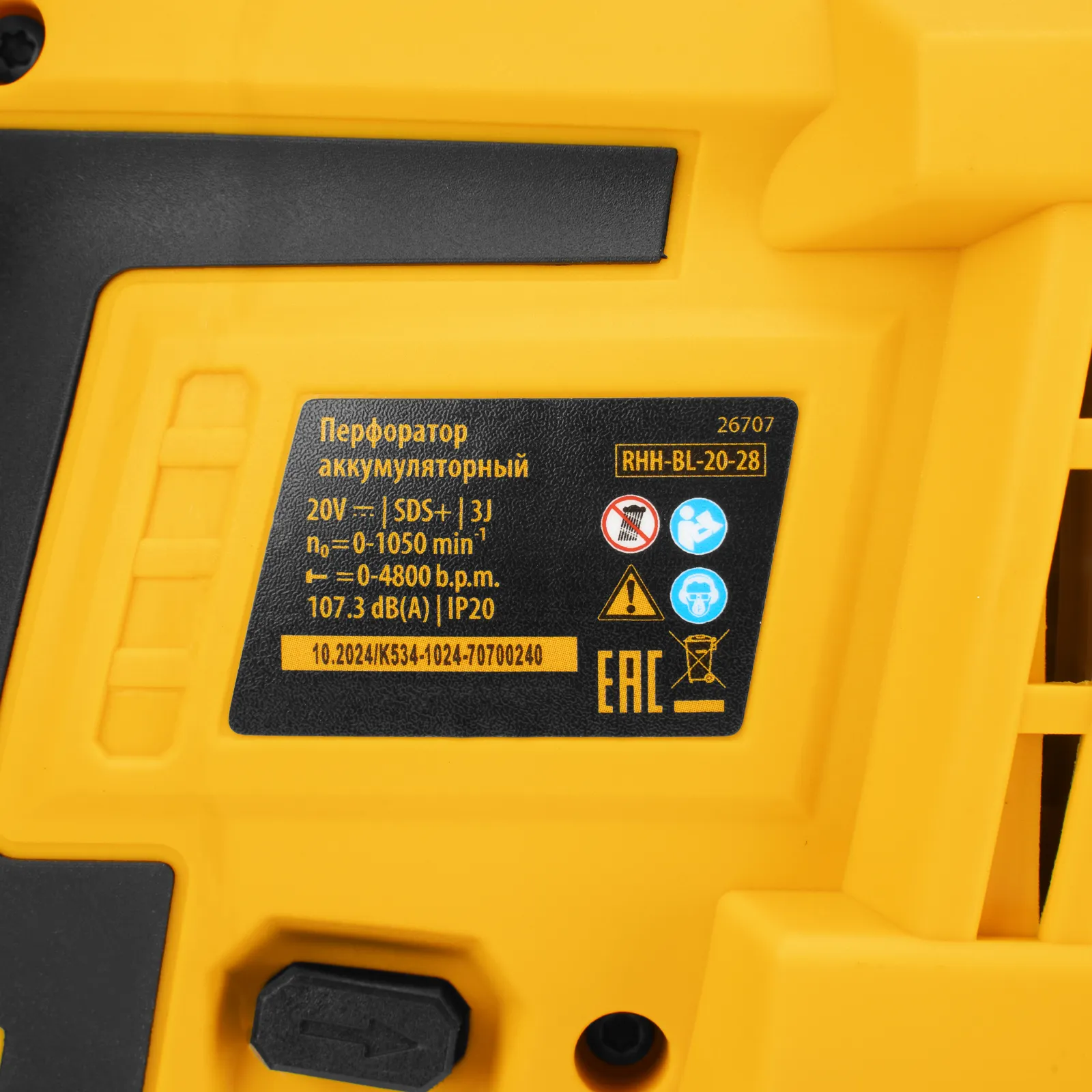 Перфоратор аккумуляторный бесщет. RHH-BL-20-28, 3 Дж, Li-Ion, 20 В 1 АКБ 4,0 А/ч, DENZEL 26707