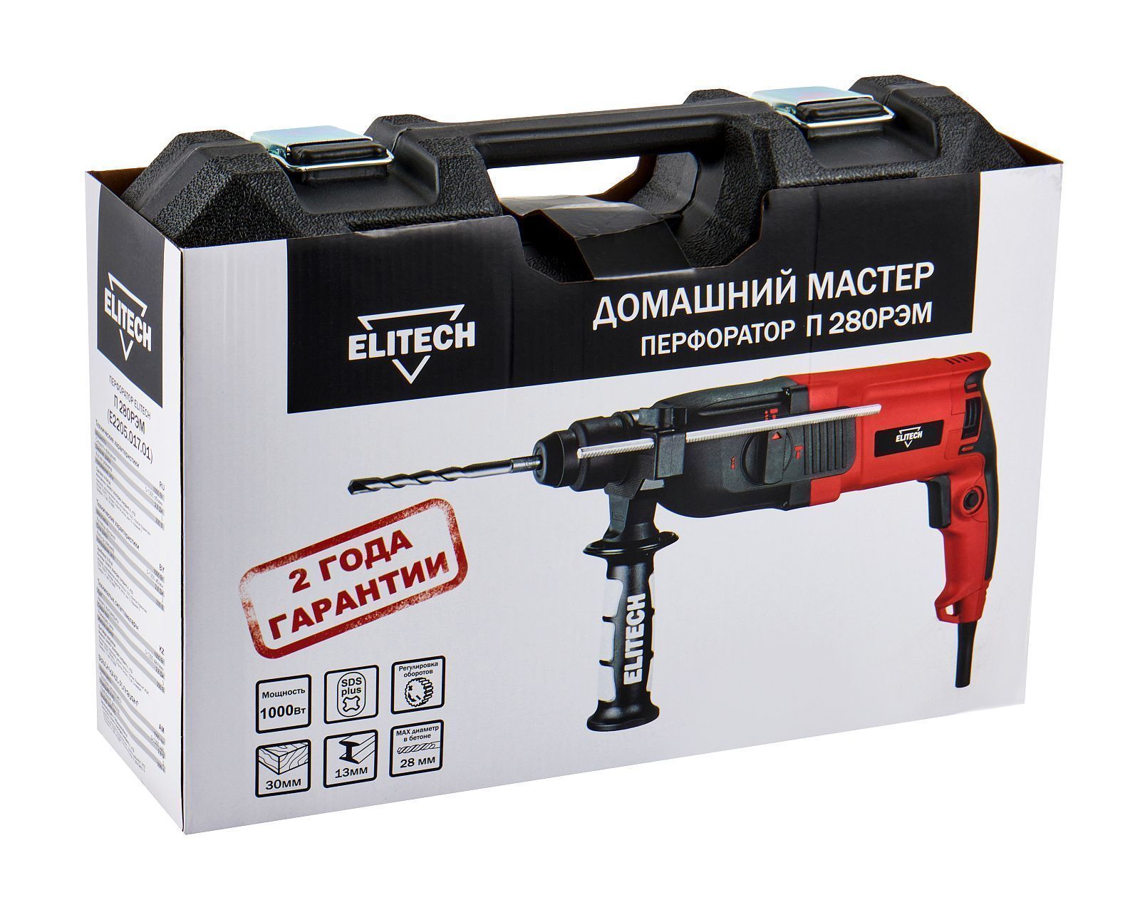 Перфоратор П 280РЭМ сетевой , ДМ ,1000Вт , 1300 об.мин, 2,8 Дж ,кейс, + патрон / 2 зубила / 3 бура , ELITECH 204026