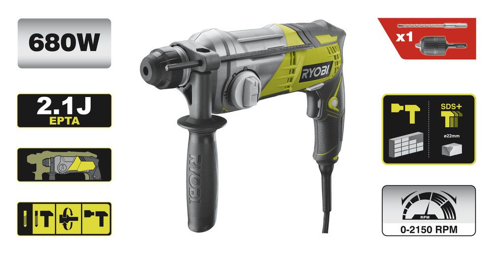 Перфоратор 680Вт, 2.4Дж, 2150об/мин, RYOBI RSDS680-K