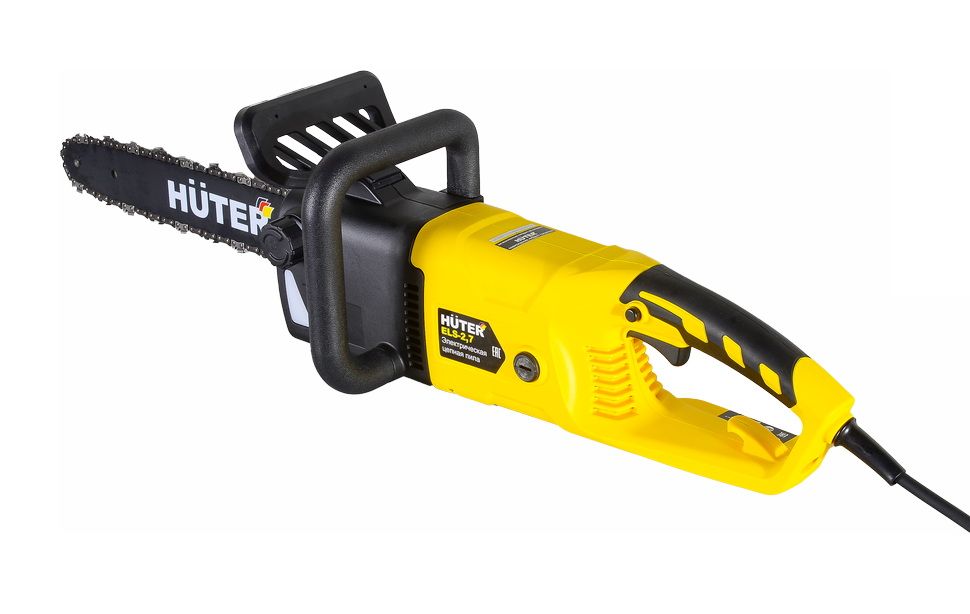 - Huter ELS-2,7 отличается удобством и безопасностью. Инструмент получил прорезиненную рукоятку небольшого размера с курком пуска, поэтому держать его в руках и работать с ним удобно. Для предотвращения отсоединения штекера от розетки в основании рукоятки предусмотрен специальный фиксатор. Пила имеет тормоз цепи, обеспечивающий безопасность во время её эксплуатации, в частности защиту рук оператора.