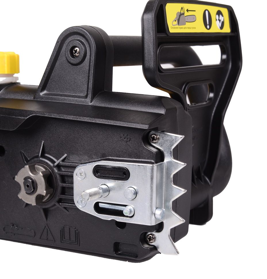 - Повышенная защита от травмирования. Цепь имеет автоматический тормоз, выполненный в виде щитка. Он позволяет защитить руки оператора от возможных травм при отскоке пилы.