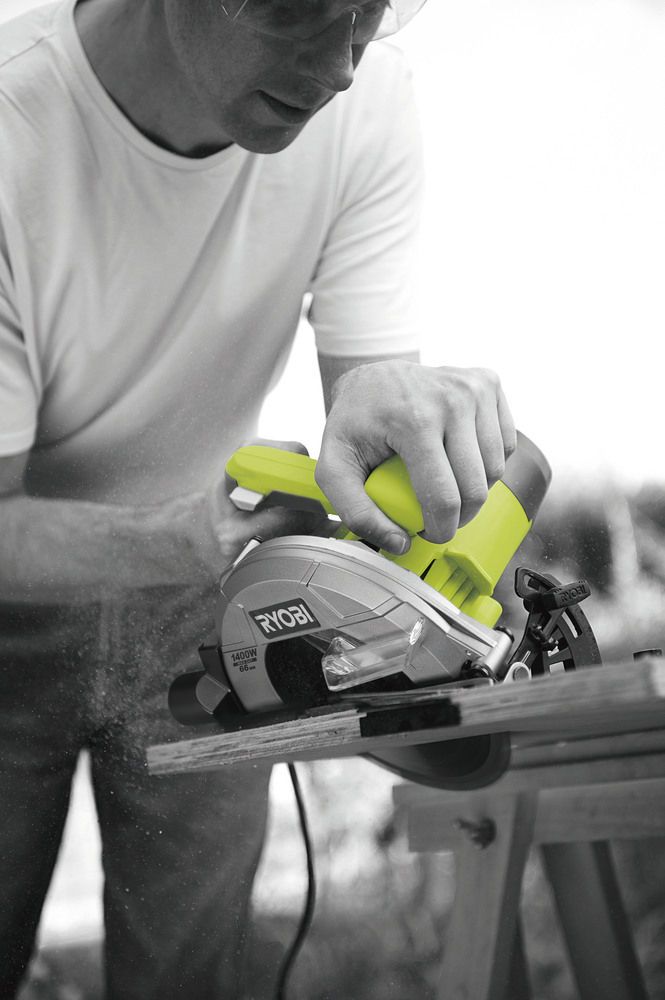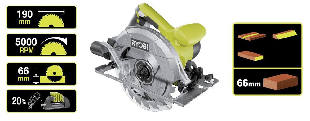 - Мощный двигатель 1400Вт для быстрого реза пиломатериалов со скоростью 5000об/мин