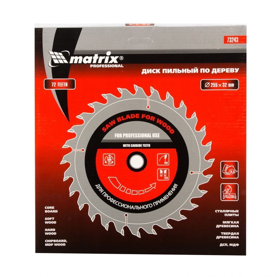 Пильный диск по дереву Matrix ф255 х 32 мм 73243 с 72 зубьями и переходным кольцом 32/30 применяется в качестве оснастки на циркулярных и торцовочных пилах с соответствующим внутренним и внешним диаметром. Он используется преимущественно для поперечного реза материалов из мягкой и твердой древесины, ДСП, ДВП, фанеры, столярных плит. В комплект входит переходное кольцо 32/30 для возможности самостоятельного изменения посадочного диаметра при необходимости.