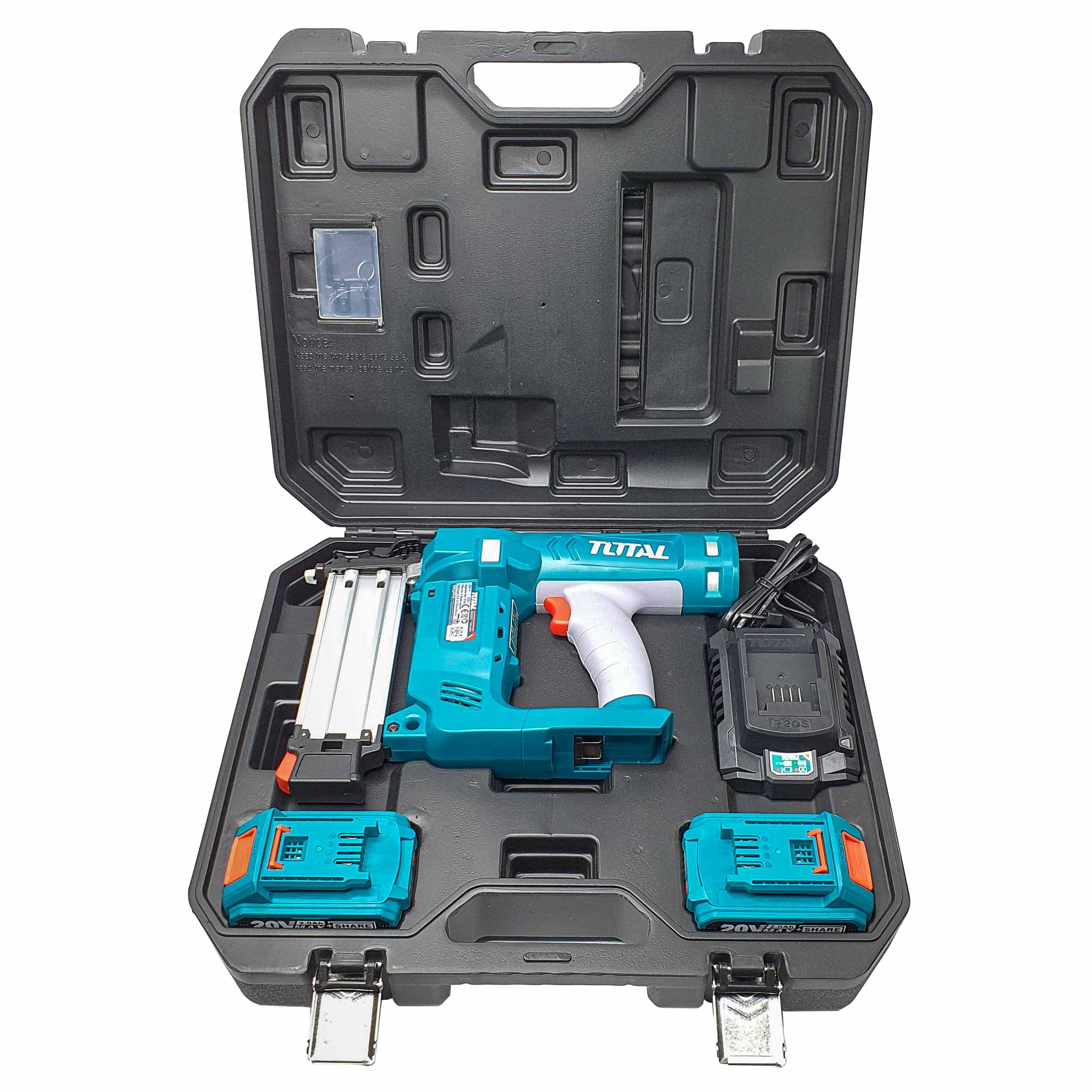 - Индустриальный финишный гвоздезабивной пистолет, работающий от аккумулятора системы TOTAL P20S, АКБ и ЗУ в комплекте.