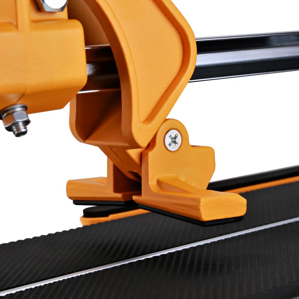 - Плиткорез оснащён прочным металлическим основанием и направляющими, что обеспечивает стабильность конструкции и высокое качество линии реза.