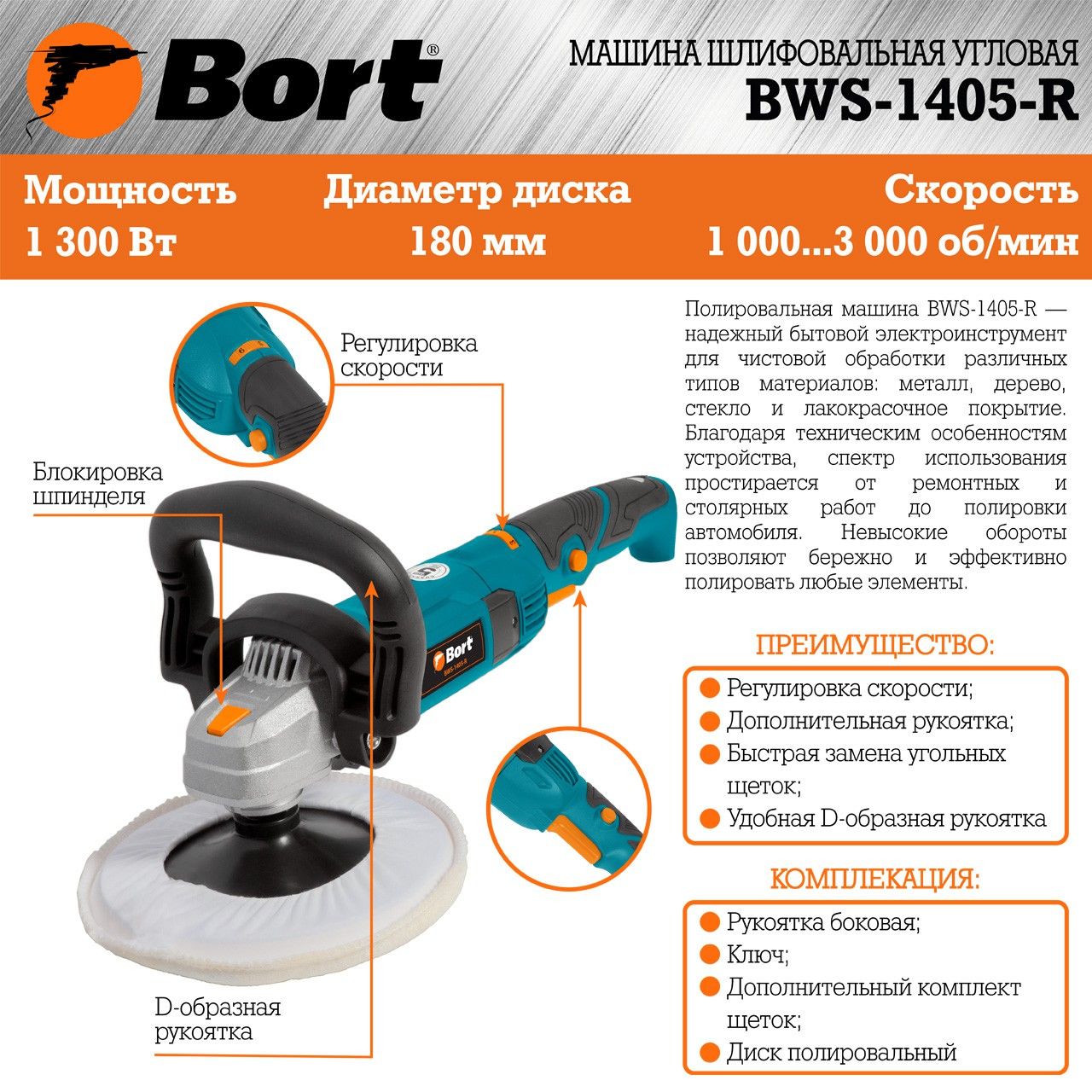 - Полировальная машина BWS-1405-R — надежный бытовой электроинструмент для чистовой обработки различных типов материалов: металл, дерево, стекло и лакокрасочное покрытие.
