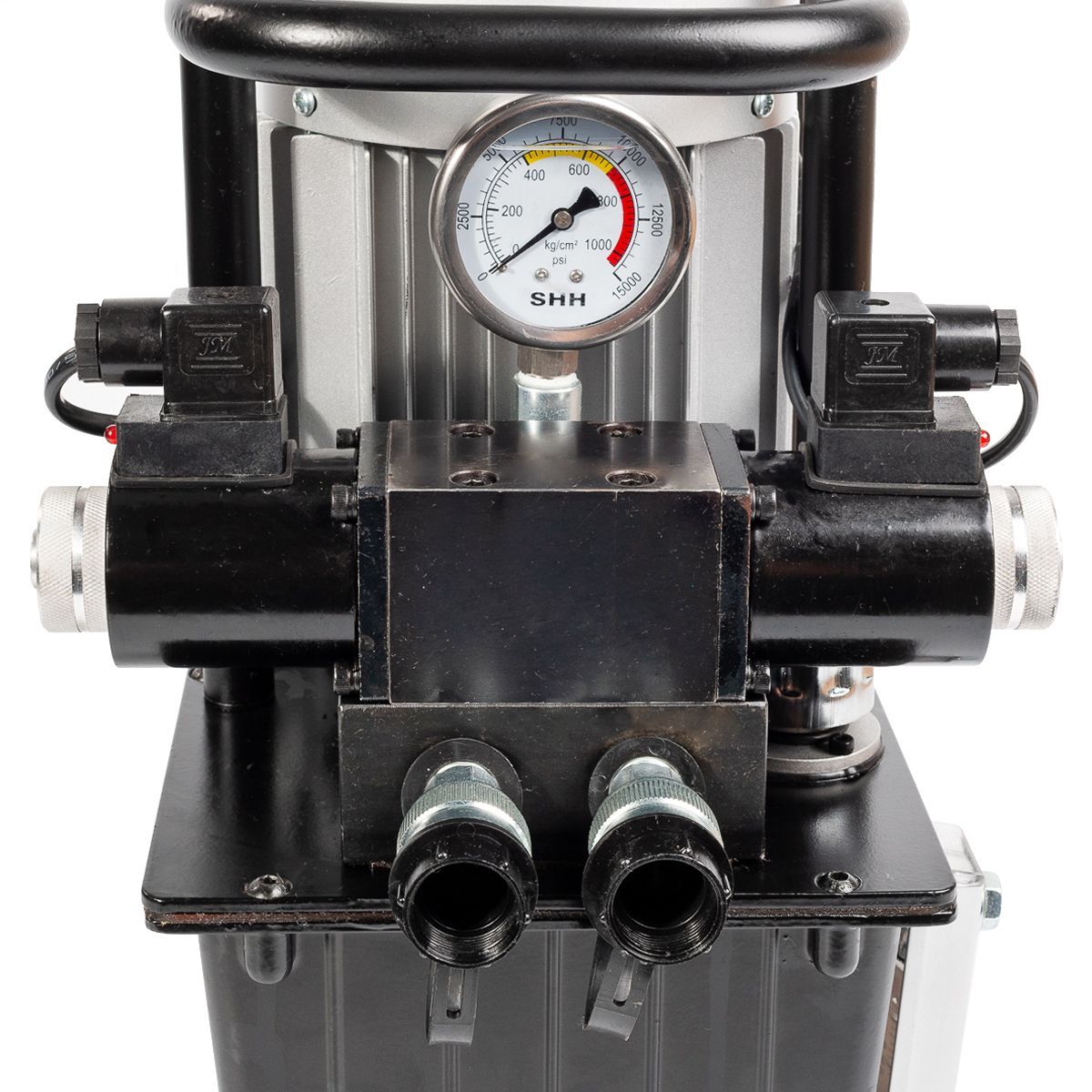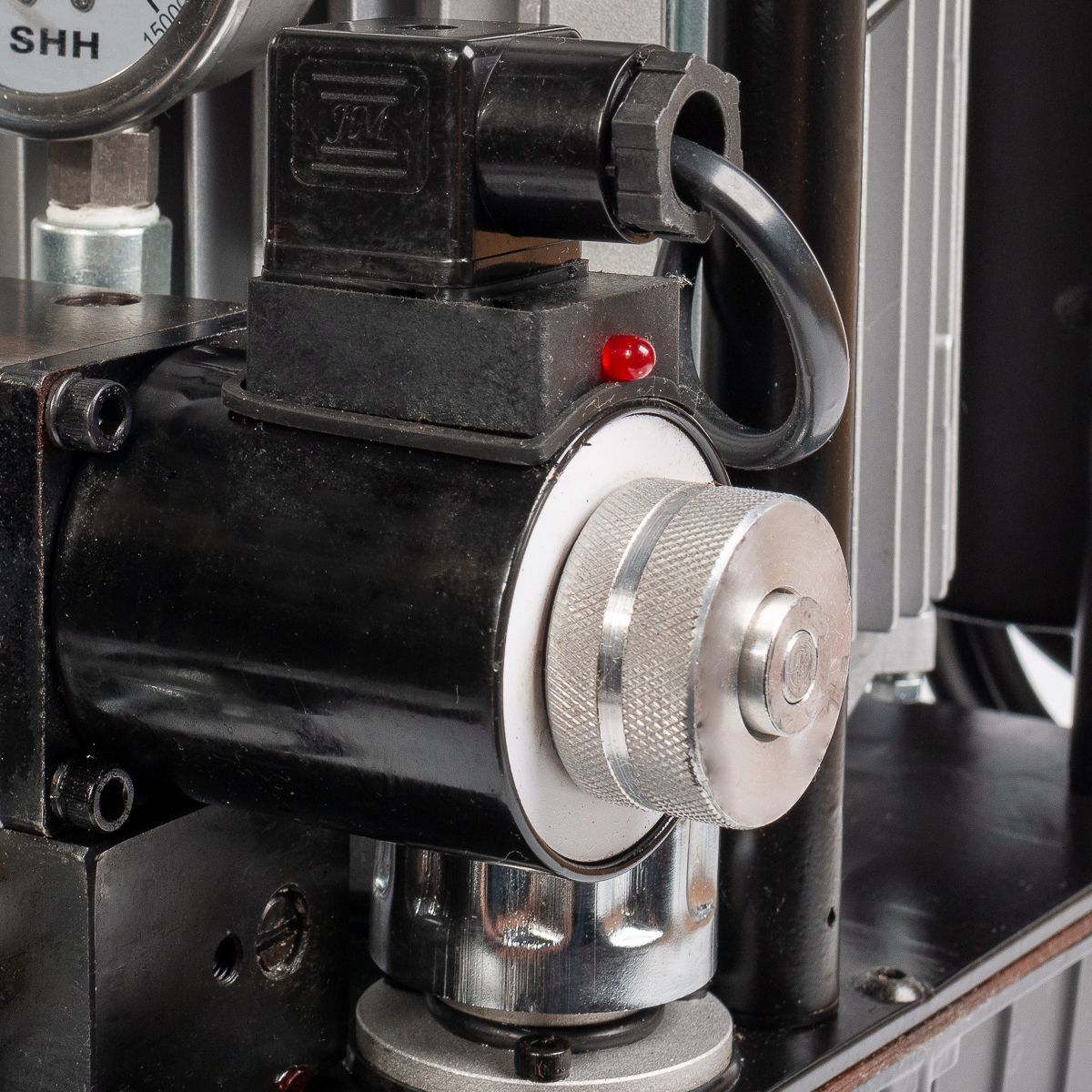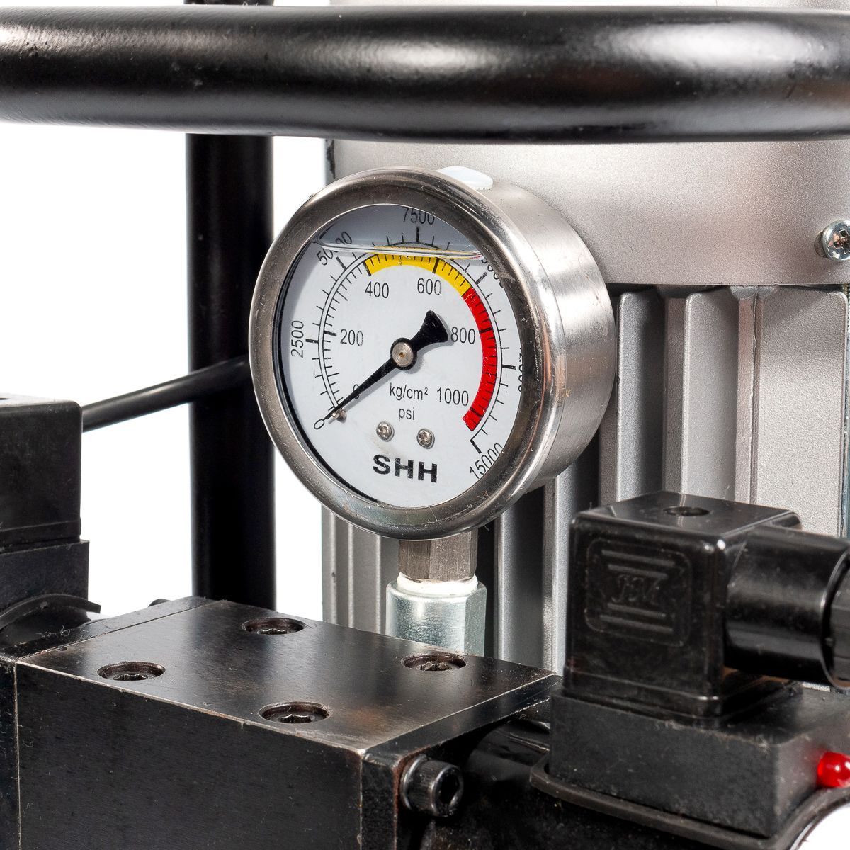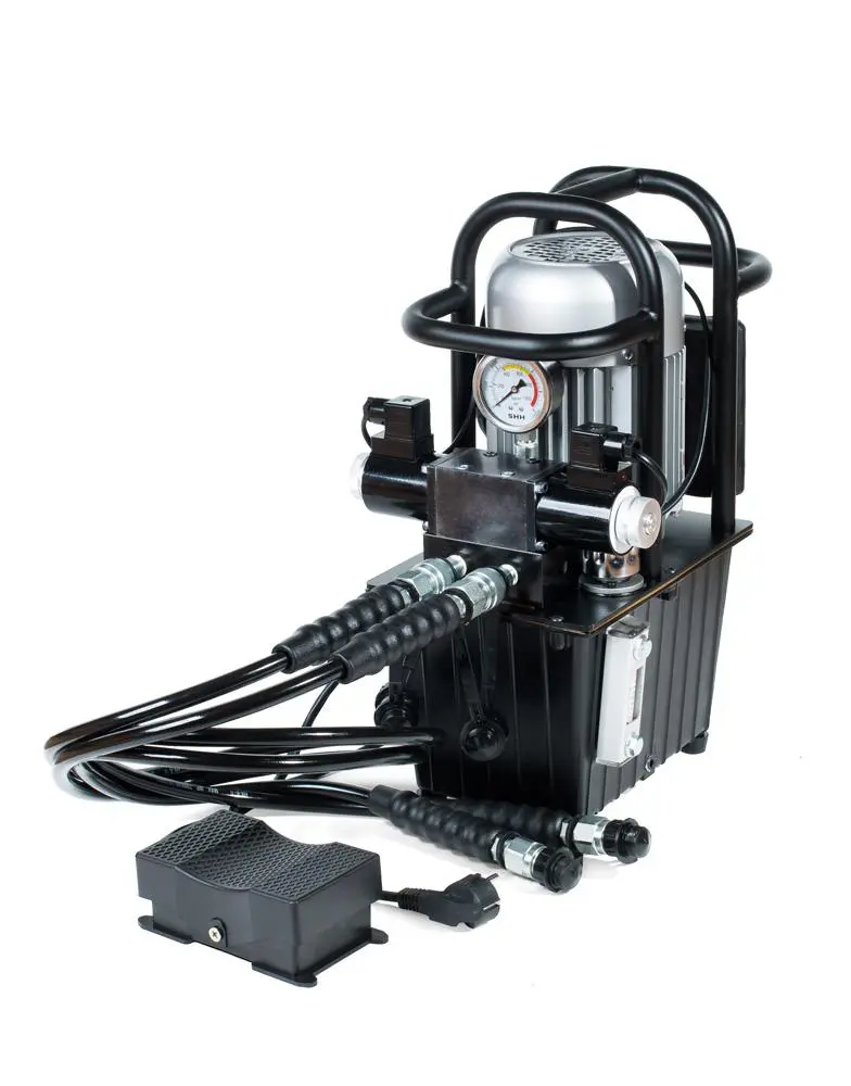 Двухклапанная конструкция позволяет управлять двумя каналами давления, а двухступенчатая система подачи обеспечивает как быстрое заполнение, так и точное достижение рабочего давления. Модель снабжена встроенным виброустойчивым манометром, а также индикатором уровня масла и термометром, встроенными в стенку маслобака для наглядного контроля параметров в реальном времени. Благодаря двум рукавам высокого давления длиной 1.8 м и дистанционному ножному пульту, оператор получает полную свободу действий и безопасность на объекте.